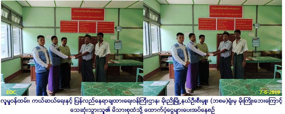 လူမှုဝန်ထမ်း၊ ကယ်ဆယ်ရေးနှင့် ပြန်လည်နေရာချထားရေးဝန်ကြီးဌာန၊ ဘေးအန္တရာယ်ဆိုင်ရာစီမံခန့်ခွဲမှုဦးစီးဌာန၊ မိုးညိုမြို့နယ်ဦးစီးမှူးရုံးမှ တာဝန်ရှိသူများသည် မင်းလှမြို့နယ်၊ ဒီလှိုင်းကျေးရွာအုပ်စု၊ ပေါက်ချောင်းကျေးရွာ (၅.၆.၂၀၁၉)ရက်နေ့က ဖြစ်ပွားခဲ့သော မိုးကြိုးဘေးမှ သေဆုံး (၁)ဦးအတွက် ထောက်ပံ့ငွေ (၃၀၀,၀၀ဝ/-)ကျပ်ကို (၇.၆.၂၀၁၉)ရက်နေ့တွင် မြို့နယ်အထွေထွေအုပ်ချုပ်ရေးဦးစီးဌာန တာဝန်ရှိသူများရှေ့မှောက် တွင် ဘေးသင့်ပြည်သူ၏ မိသားစုများ လက်ဝယ်ထောက်ပံ့ပေးအပ်ခဲ့ပါကြောင်း သတင်းရရှိပါသည်။