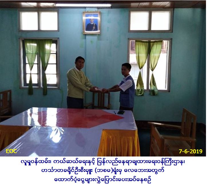 လူမှုဝန်ထမ်း၊ ကယ်ဆယ်ရေးနှင့် ပြန်လည်နေရာချထားရေးဝန်ကြီးဌာန၊ ဘေးအန္တရာယ်ဆိုင်ရာစီမံခန့်ခွဲမှုဦးစီးဌာန၊ ဟင်္သာတခရိုင်ဦးစီးမှူးရုံးမှ တာဝန်ရှိသူများသည် ကြံခင်းမြို့နယ် (တလိုင်းကွင်း၊ ကဇင်းကြီး)ကျေးရွာအုပ်စု၊ (ပန်းရံစု၊ ကဇင်းကြီး)ကျေးရွာတို့တွင် (၃၁-၅-၂၀၁၉) နေ့ဖြစ်ပွားသောလေဘေးသင့်တစ်စိတ်တစ်ပိုင်းအိမ်ခြေ (၂)လုံး၊ အိမ်ထောင်စု(၂)စုအတွက် အိမ်ဆောက်ပစ္စည်းဖိုးကျပ် (၁၈၀,၀၀၀/-)၊ ဘေး သင့်လူဦးရေ (၅)ဦးအတွက် ဆန်ရိက္ခာ (၇)ရက်စာရန်ပုံ ငွေကျပ်(၁၀,၅၀၀/-)၊ စုစုပေါင်းရန်ပုံငွေကျပ် (၁၉၀,၅၀၀/-)ကို (၇-၆-၂၀၁၉)ရက်နေ့ တွင် ကြံခင်းမြို့နယ်အထွေ ထွေအုပ်ချုပ်ရေးဦးစီးဌာနမှ တာဝန်ရှိသူထံသို့ လွှဲပြောင်းထောက်ပံ့ပေးအပ်ခဲ့ပါကြောင်း သတင်းရရှိပါသည်။