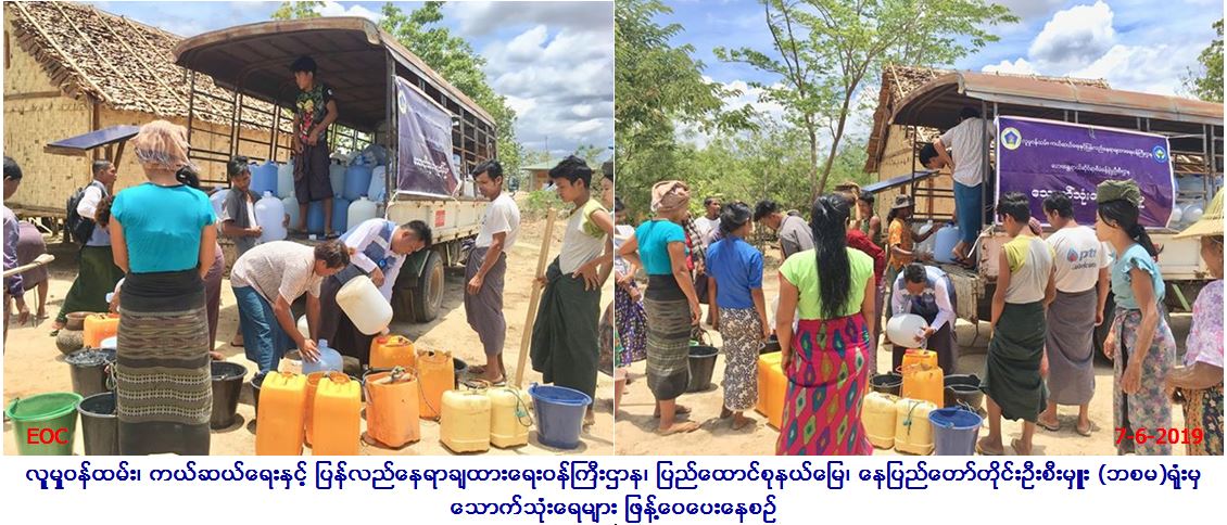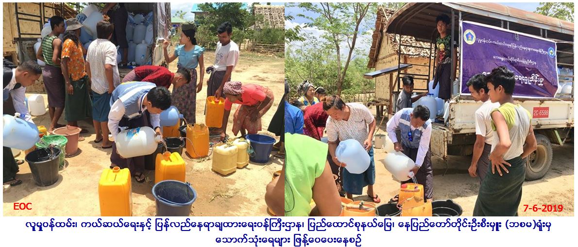 လူမှုဝန်ထမ်း၊ ကယ်ဆယ်ရေးနှင့် ပြန်လည်နေရာချထားရေးဝန်ကြီးဌာန၊ ဘေးအန္တရာယ်ဆိုင်ရာစီမံခန့်ခွဲမှုဦးစီးဌာန၊ ပြည်ထောင်စုနယ်မြေ၊ နေပြည်တော်တိုင်းဦးစီးမှူးရုံးမှ တာဝန်ရှိသူများနှင့် နေပြည်တော်တိုင်း ကြက်ခြေနီကြီးကြပ်မှုကော်မတီဥက္ကဌတို့သည် (၇-၆-၂၀၁၉) ရက်နေ့ (၁၂း၀၀) အချိန်မှ (၁၅း၀၀) အချိန်ထိ သောက်သုံးရေအခက်အခဲရှိသော ဒက္ခိဏခရိုင်၊ လယ်ဝေးမြို့နယ်၊ အောင်သာကျေးရွာအုပ်စု၊ အောင်သာကျေးရွာ အမှတ်(၇) နယ်မြေစုရှိ အိမ်ခြေ(၉၀)အတွက်လည်းကောင်း၊ အမှတ်(၈) အောင်သပြေကျေးရွာရှိ အိမ်ခြေ (၅၈)အတွက် လည်းကောင်း၊ စုစုပေါင်း ကျေးရွာနေပြည်သူလူထု (၆၆၁)ဦးအတွက် သောက်ရေ(၂၀)လီတာဘူး စုစုပေါင်း(၂၄၀)ဘူးအား သွားရောက် ထောက်ပံ့ဖြန့်ဝေပေးခဲ့ကြောင်း သတင်းရရှိပါသည်။