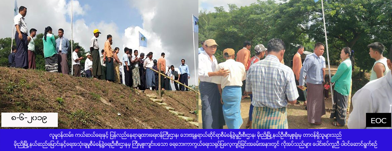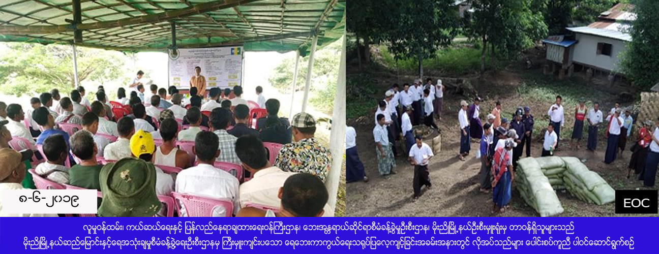 လူမှုဝန်ထမ်း၊ ကယ်ဆယ်ရေးနှင့် ပြန်လည်နေရာချထားရေးဝန်ကြီးဌာန၊ ဘေးအန္တရာယ်ဆိုင်ရာစီမံခန့်ခွဲမှုဦးစီးဌာန၊ မိုးညိုမြို့နယ်ဦးစီးမှူးရုံးမှ တာဝန်ရှိသူများသည် (၈-၆-၂၀၁၉) ရက်နေ့တွင် မိုးညိုမြို့နယ်၊ ညောင်ဝိုင်းကျေးရွာအုပ်စု၊ ညောင်ဝိုင်းကျေးရွာ၊ ခအောင်းပင်တာ၌ ဆည်မြောင်းနှင့်ရေအသုံးချမှုစီမံခန့်ခွဲ့ရေးဦးစီးဌာနမှ ကြီးမှူးကျင်းပသော မိုးတွင်းကာလ တာတမံကြံ့ခိုင်ရေး၊ တာကျိုးပေါက်မှုများဖြစ်ပေါ်လာပါက အချိန်နှင့်တပြေးညီပြုပြင်ထိန်းသိမ်းတတ်စေရန် ရည်ရွယ်၍ ရေဘေးကာကွယ်ရေးသရုပ်ပြလေ့ကျင့်ခြင်းအခမ်းအနားကို ကျင်းပဆောင်ရွက်ခဲ့ရာ လိုအပ်သည်များကို ပေါင်းစပ်ညှိနှိုင်းကူညီခဲ့ကြောင်းနှင့် အခမ်းအနားသို့ လွှတ်တော်ကိုယ်စားလှယ်များ၊ မြို့နယ်အုပ်ချုပ်ရေးမှူး၊ ဌာနဆိုင်ရာအကြီးအကဲများ၊ သဘာဝဘေးစီမံခန့်ခွဲမှုကော်မတီဝင်များ၊ ကျေးရွာနေပြည်သူများ၊ စုစုပေါင်းအင်အား(၁၀၀)ဦးခန့် တက်ရောက်ခဲ့ပြီး တက်ရောက်လာသူများကို ရေဘေးကာကွယ်ရေးနှင့်ပတ်သက်၍ လက်ကမ်းစာဆောင်များဝေငှခဲ့ကြောင်း သိရှိရပါသည်။