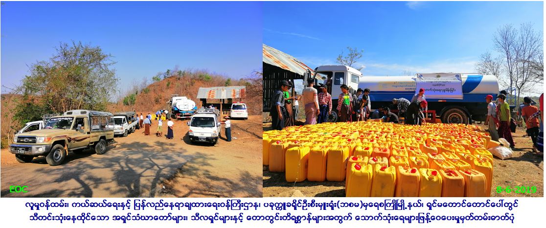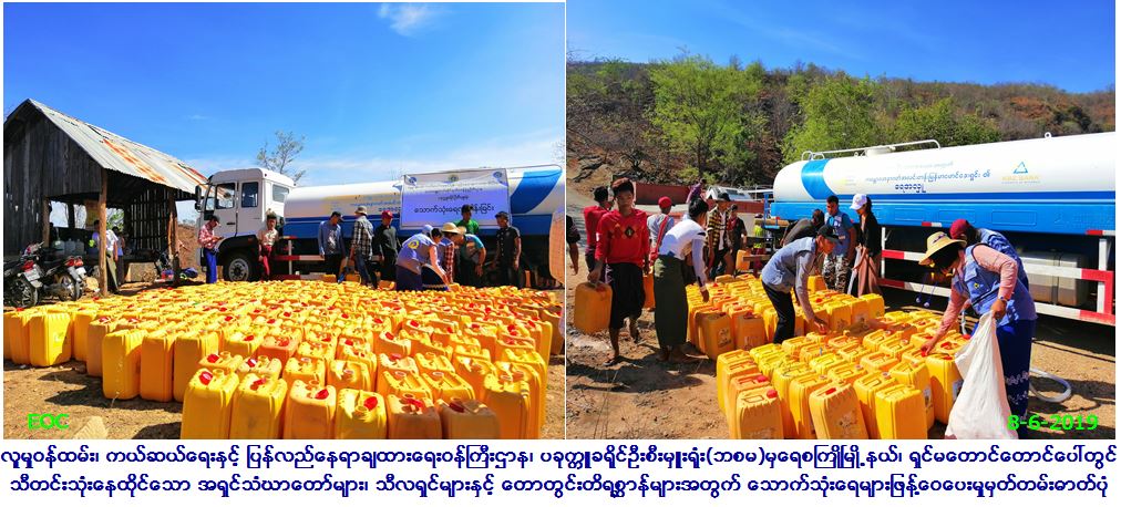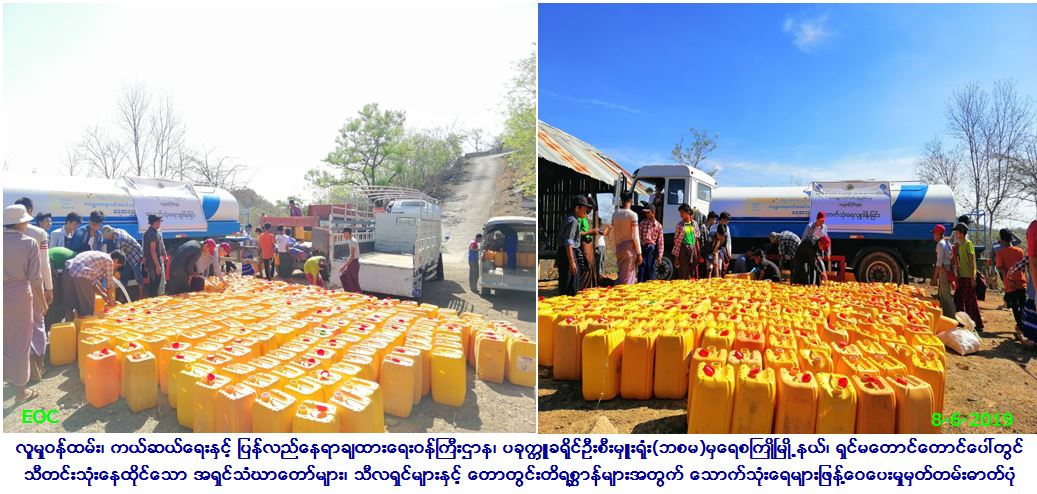 သောက်သုံးရေဖြန့်ဝေနိုင်ရန်အတွက် မြသဇင် စက်သုံးဆီဆိုင်(ရေစကြို)ရေတိုင်မှ ရေကားသို့ သောက်သုံးရေ အခမဲ့ဖြည့်ပေးခြင်းဖြင့် ဝိုင်းဝန်းကူညီပံ့ပိုးခဲ့ပါသည်။