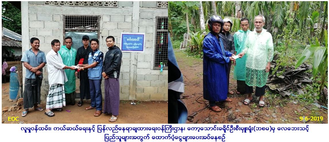 လူမှုဝန်ထမ်း၊ ကယ်ဆယ်ရေးနှင့် ပြန်လည်နေရာချထားရေးဝန်ကြီးဌာန၊ ဘေးအန္တရာယ်ဆိုင်ရာစီမံခန့်ခွဲမှုဦးစီးဌာန၊ ကော့သောင်းခရိုင် ဦးစီးမှူးရုံးမှ တာဝန်ရှိသူများသည် (၉-၆-၂၀၁၉)ရက်နေ့ ကော့သောင်းမြို့နယ်၊ ချန်းဖန်းကျေးရွာအုပ်စု၊ ဘန်နွားကျေးရွာတွင် ဖြစ်ပွားသည့် မိုးသက်လေပြင်းဘေးကြောင့် ဘေးသင့်အိမ်ခြေ(၂)၊ အိမ်ထောင်စု(၂)၊ လူဦးရေ(၄)ဦးအတွက် ကယ်ဆယ်ရေးပစ္စည်း(၁၀)မျိုးနှင့် ထောက်ပံ့ငွေ (၁၆၀,၀၀၀/-)ကျပ်တို့အား (၉-၆-၂၀၁၉)ရက်နေ့တွင် သွားရောက်ထောက်ပံ့ပေးခဲ့ကြောင်း သတင်းရရှိပါသည်။