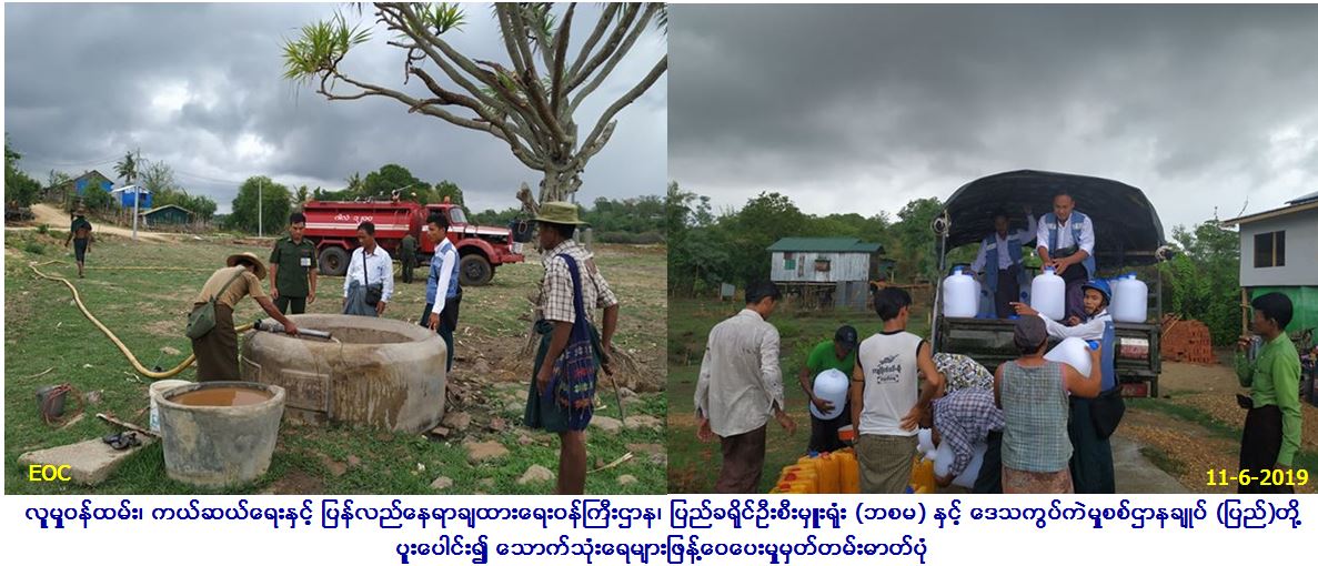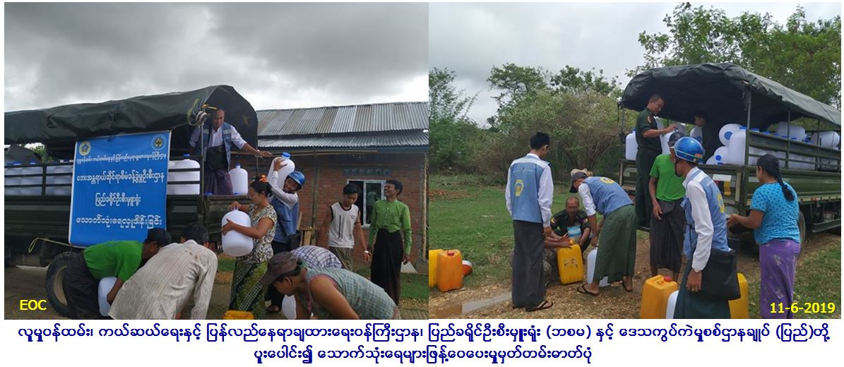 လူမှုဝန်ထမ်း၊ ကယ်ဆယ်ရေးနှင့် ပြန်လည်နေရာချထားရေးဝန်ကြီးဌာန၊ ဘေးအန္တရာယ်ဆိုင်ရာစီမံခန့်ခွဲမှုဦးစီးဌာန၊ ပြည်ခရိုင်ဦးစီးမှူးရုံးမှ တာဝန်ရှိသူများနှင့် ဒေသကွပ်ကဲမှုစစ်ဌာနချုပ် (ပြည်)တို့ပူးပေါင်း၍ (၁၁.၆.၂၀၁၉)ရက်နေ့ (၀၉း၀၀)နာရီအချိန်တွင် ပန်းတောင်းမြို့နယ်၊ ဆင်တဲကျေးရွာအုပ်စု အင်းဝင်းကျေးရွာနှင့် ပုတီးတောကျေးရွာတို့တွင် သောက်သုံးရေရှားပါးနေသည့် အိမ်ခြေအိမ်ထောင်စု (၁၂၄) အိမ်ထောင်စုတို့အတွက် သုံးရေဂါလံ (၁၂၀၀)၊ သောက်ရေသန့် (၂၀)လီတာဗူး (၂၄၈)ဗူးတို့အား သွားရောက်ဖြန့်ဝေပေးခဲ့ကြောင်း သတင်း ရရှိပါသည်။