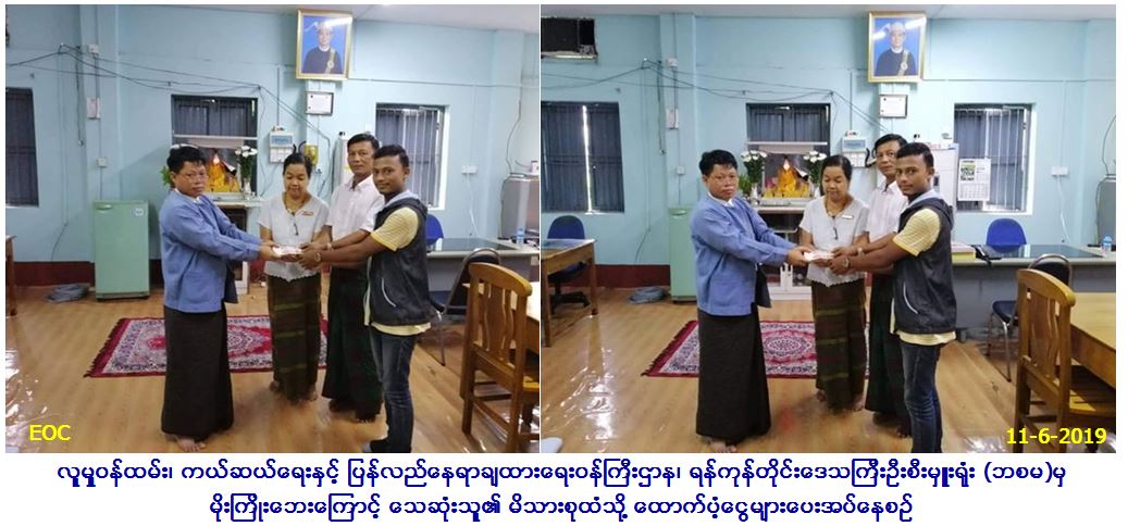 လူမှုဝန်ထမ်း၊ ကယ်ဆယ်ရေးနှင့်ပြန်လည်နေရာချထားရေးဝန်ကြီးဌာန၊ ဘေးအန္တရာယ်ဆိုင်ရာစီမံခန့်ခွဲမှုဦးစီးဌာန၊ ရန်ကုန်တိုင်း ဒေသကြီးဦးစီးမှူးရုံးမှ တာဝန်ရှိသူများသည် ရန်ကုန်တိုင်းဒေသကြီး၊ ကြည့်မြင်တိုင်မြို့နယ်၊ စက်ဆန်းအောက်ရုံအလတ်ချောင်းရပ်ကွက်၊ အလတ်ချောင်းအပိုင်၊ သီဟဗလ(၁၂)လမ်းနေ ဦးကိုကိုလွင်၏ သားဖြစ်သူ မောင်သဲမောင် (၁၃)နှစ်သည် (၂၄.၅.၂၀၁၉)ရက်နေ့ (၁ရး၀၀) နာရီအချိန်ခန့်တွင် ဘောလုံးကစားနေစဉ် မိုးကြိုးစက်ကွင်းထိမှန်ခဲ့သဖြင့် ရန်ကုန်အနောက်ပိုင်းဆေးရုံသို့ပို့ဆောင်ကာ (၂၅.၅.၂၀၁၉)ရက်နေ့ (၀၆း၅၅)နာရီတွင် သေဆုံးသွားသဖြင့် (၁၁.၆.၂၀၁၉)ရက်နေ့တွင် ကျန်ရစ်သူမိသားစုထံသို့ သေဆုံးထောက်ပံ့ငွေ (၃၀၀,၀၀၀/-)ကျပ်ကို သက်ဆိုင်ရာမြို့နယ်ထွေအုပ်နှင့်အတူ သွားရောက်ထောက်ပံ့ပေးခဲ့ပါကြောင်း သတင်းရရှိပါသည်။