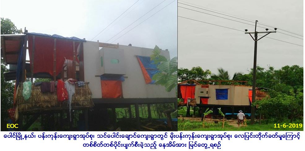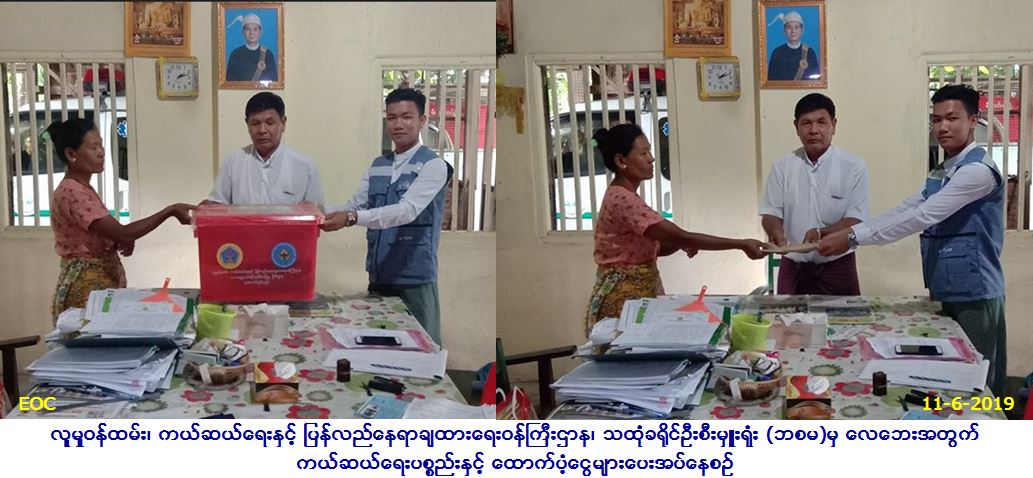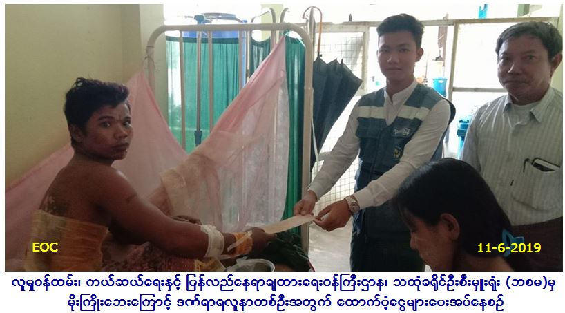 လူမှုဝန်ထမ်း၊ ကယ်ဆယ်ရေးနှင့် ပြန်လည်နေရာချထားရေးဝန်ကြီးဌာန၊ ဘေးအန္တရာယ်ဆိုင်ရာစီမံခန့်ခွဲမှုဦးစီးဌာန၊ သထုံခရိုင်ဦးစီးမှူးရုံးမှ တာဝန်ရှိသူများသည် (၁၁.၆.၂၀၁၉)ရက်နေ့၊ (၀၂း၀၀)နာရီခန့်တွင် ပေါင်မြို့နယ်၊ ပန်းကုန်းကျေးရွာအုပ်စု၊ သင်ပေါင်းချောင်ကျေးရွာတွင် မိုးပန်းကုန်းကျေးရွာအုပ်စု၊ လေပြင်းတိုက်ခတ်မှုကြောင့် တစ်စိတ်တစ်ပိုင်းပျက်စီးခဲ့သည့် လူနေအိမ်(၁)လုံးအတွက် အိမ်ဆောက်ပစ္စည်းဖိုးငွေ (၁၀၀,၀၀၀/-)၊ လူဦးရေ (၅)ဦးအတွက် (၇)စာ ဆန်ဖိုးငွေ(၁၀,၅၀၀/-)ကျပ်၊ စုစုပေါင်း(၁၁၀,၅၀၀/-) အိမ်ထောင်စု(၁)စုအတွက် ကယ်ဆယ်ရေးပစ္စည်း (၁၁)မျိုး၊ တန်ဖိုးငွေ(၁၈,၅၁၀/-) နှင့် (၁၁.၆.၂၁၉)ရက်နေ့၊ (၀၄း၃၀)နာရီခန့်တွင် ပေါင်မြို့နယ်၊ ဝဲပတန်ကျေးရွာအနီး ပင်လယ်ပြင်တွင် ငါးဖမ်းထွက်စဉ် မိုးကြိုးပစ်ချမှုကြောင့် မိုးကြိုးစက်ကွင်းထိမှန်၍ဒဏ်ရာရရှိခဲ့သူ အမျိုးသား(၁)ဦးအတွက် ထောက်ပံ့ငွေ (၅၀,၀၀၀/-)ကျပ်တို့အား ဘေးသင့်ပြည်သူများထံသို့ (၁၁.၆.၂၀၁၉)ရက်နေ့တွင် သွားရောက်ထောက်ပံ့ခဲ့ပါကြောင်း သတင်းရရှိပါသည်။