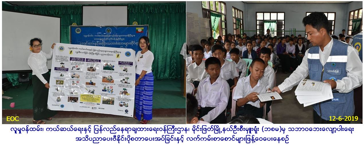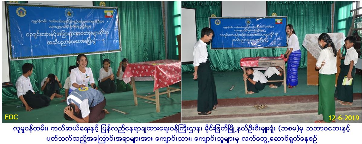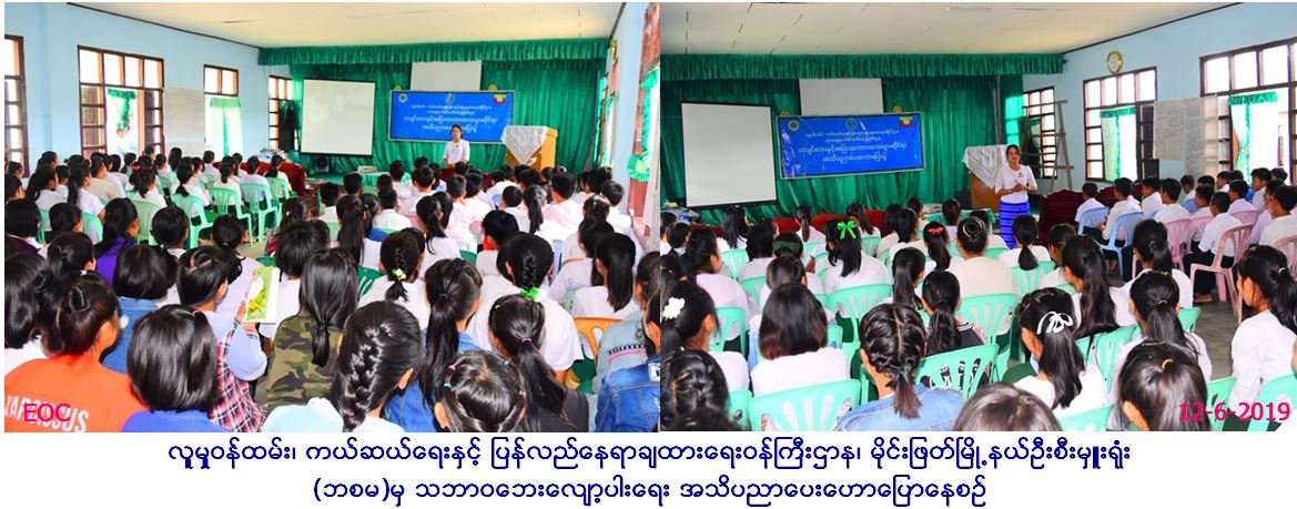 လူမှုဝန်ထမ်း၊ ကယ်ဆယ်ရေးနှင့် ပြန်လည်နေရာချထားရေးဝန်ကြီးဌာန၊ ဘေးအန္တရာယ်ဆိုင်ရာစီမံခန့်ခွဲမှုဦးဌာန၊ မိုင်းဖြတ်မြို့နယ်ဦးစီးမှူးရုံးမှ တာဝန်ရှိသူများသည် (၁၂-၆-၂၀၁၉)ရက်နေ့ နံနက် (၉း၃၀)နာရီမှ (၁၁း၃၀)နာရီထိ အ-ထ-က မိုင်းဖြတ်ကျောင်းတွင် ကျောင်းသား၊ ကျောင်းသူ (၂၀၀)ဦးအား သဘာဝဘေးအသိပညာပေး ဟောပြောပွဲပြုလုပ်ခဲ့ပြီး အသိပညာပေးလက်ကမ်းစာစောင်နှင့် ဗီနိုင်းပိုစတာများ ဖြန့်ဝေပေးခဲ့ပါကြောင်း သတင်းရရှိပါသည်။