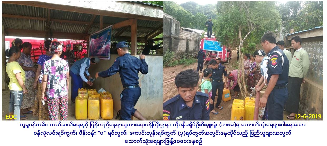 လူမှုဝန်ထမ်း၊ ကယ်ဆယ်ရေးနှင့်ပြန်လည်နေရာချထားရေးဝန်ကြီးဌာန၊ ဘေးအန ္တရာယ်ဆိုင်ရာစီမံခန့်ခွဲမှုဦးစီးဌာန၊ဟိုပန်ခရိုင်ဦးစီးမှူးရုံးမှ တာဝန်ရှိသူများသည် (၁၂-၆-၂၀၁၉)ရက်နေ့တွင် ခရိုင်အထွေထွေအုပ်ရေးဦးစီးဌာန၊ မြို့နယ်အထွေထွေအုပ်ချုပ်ရေးစီးဌာန၊ ခရိုင်မီးသတ်ဦးစီး ဌာနတို့နှင့် အတူပူးပေါင်း၍ ဟိုပန်ခရိုင်၊ ဟိုပန်မြိုနယ်အတွင်းရှိ သောက်သုံးရေရှားပါးနေသော ပန်လုံလမ်းရပ်ကွက်၊ မိန်းပန်း”ဝ”ရပ်ကွက်၊ ကောင်းဟုန်းရပ်ကွက် (၃)ရပ်ကွက်တို့တွင် ရေဂါလံ(၈၈၀၀)ဂါလံကို သွားရောက်ဖြန့်ဝေပေးခဲ့ကြောင်း သတင်းရရှိပါသည်။