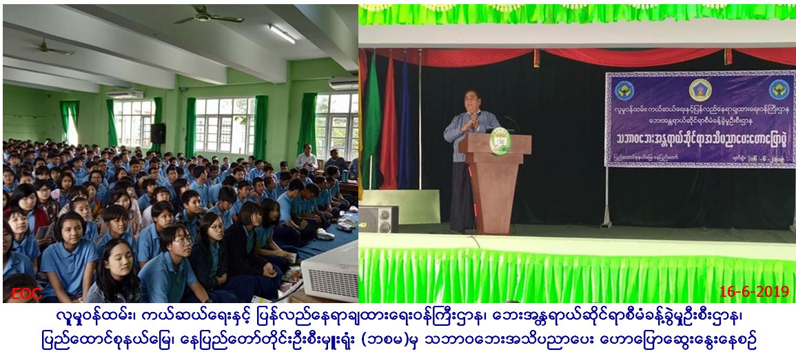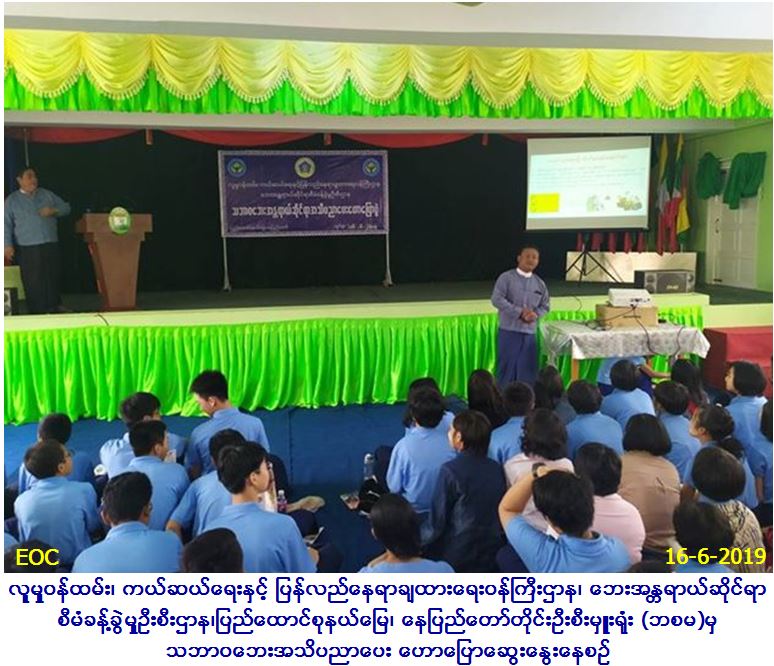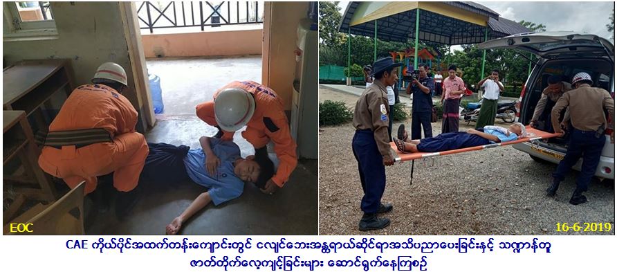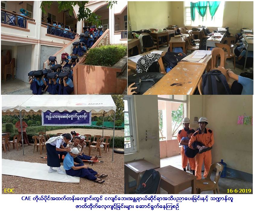 လူမှုဝန်ထမ်း၊ ကယ်ဆယ်ရေးနှင့်ပြန်လည်နေရာချထားရေးဝန်ကြီးဌာန၊ ဘေးအန္တရာယ်ဆိုင်ရာစီမံခန့်ခွဲမှုဦးစီးဌာန၊ ပြည်ထောင်စုနယ်မြေ၊ နေပြည်တော်တိုင်းဦးစီးမှူးရုံးမှ တိုင်းဦးစီးမှူးဦးဆောင်၍ (၁၆-၆-၂၀၁၉)ရက်နေ့၊ နေ့လည် (၁၂) နာရီမှ (၁၄:၄၅) အချိန်ထိ CAE ကိုယ်ပိုင် အထက်တန်းကျောင်းတွင် ငလျင်ဘေးအန္တရာယ်ဆိုင်ရာအသိပညာပေးခြင်းနှင့် သဏ္ဍာန်တူဇာတ်တိုက်လေ့ကျင့်ခြင်းများ ဆောင်ရွက်ခဲ့ရာ ဆရာ/ဆရာမ ကျောင်းသား/သူ (၃၅၀) ဦးတက်ရောက်ခဲ့ပြီး အဆိုပါအခမ်းအနားသို့ ပြည်သူ့လွှတ်တော်ကိုယ်စားလှယ် ဦးကျော်မင်းလှိုင်၊ ဒုတိယခရိုင်အုပ်ချုပ်ရေးမှူးမြင့်အောင်၊ မြို့နယ်အုပ်ချုပ်ရေးမှူး ဦးညီညီအောင်၊ မီးသတ်ဦးစီဌာနမှ တာဝန်ရှိသူများ၊ ကြက်ခြေနီကြီးကြပ်မှု ကော်မတီမှ တာဝန်ရှိသူများတက်ရောက်ခဲ့ပါကြောင်း သတင်းရရှိပါသည်။