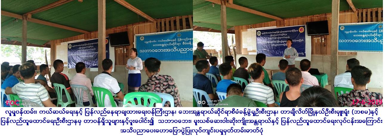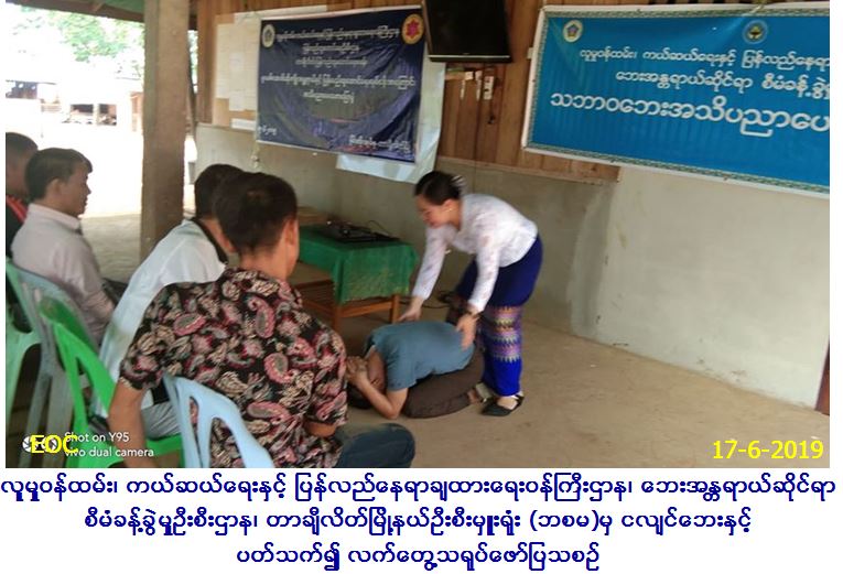 လူမှုဝန်ထမ်း ကယ်ဆယ်ရေးနှင့် ပြန်လည်နေရာချထားရေးဝန်ကြီးဌာန၊ ဘေးအန္တရာယ်ဆိုင်ရာစီမံခန့်ခွဲမှုဦးစီးဌာန၊ တာချီလိတ်မြို့နယ်ဦးစီး မှူးရုံးမှ တာဝန်ရှိသူများသည် ပြန်လည်ထူထောင်ရေးဦးစီးဌာနမှ တာဝန်ရှိသူများနှင့်ပူးပေါင်း၍ (၁၇-၆-၂၀၁၉)ရက်နေ့ နံနက်(၁၀း၀၀)နာရီမှ (၁၂း၀၀)နာရီထိ တာချီလိတ်မြို့နယ်၊ မိုင်းကိုးကျေးရွာအုပ်စု၊ ရန်ကုန် ကျေးရွာအတွင်းရှိ ပြည်သူ့စစ်စခန်း၌ တက်ရောက်သူစုစုပေါင်း (၅၅) ဦး ကို သဘာဝဘေးအသိပညာပေးခြင်းနှင့် မူးယစ်ဆေးဝါးဆိုးကျိုးအန္တရာယ်နှင့် ပြန်လည်ထူထောင်ရေးလုပ်ငန်းအကြောင်း အသိပညာပေးခြင်း များ ဆောင်ရွက်ခဲ့ပါကြောင်း သတင်းရရှိပါသည်။