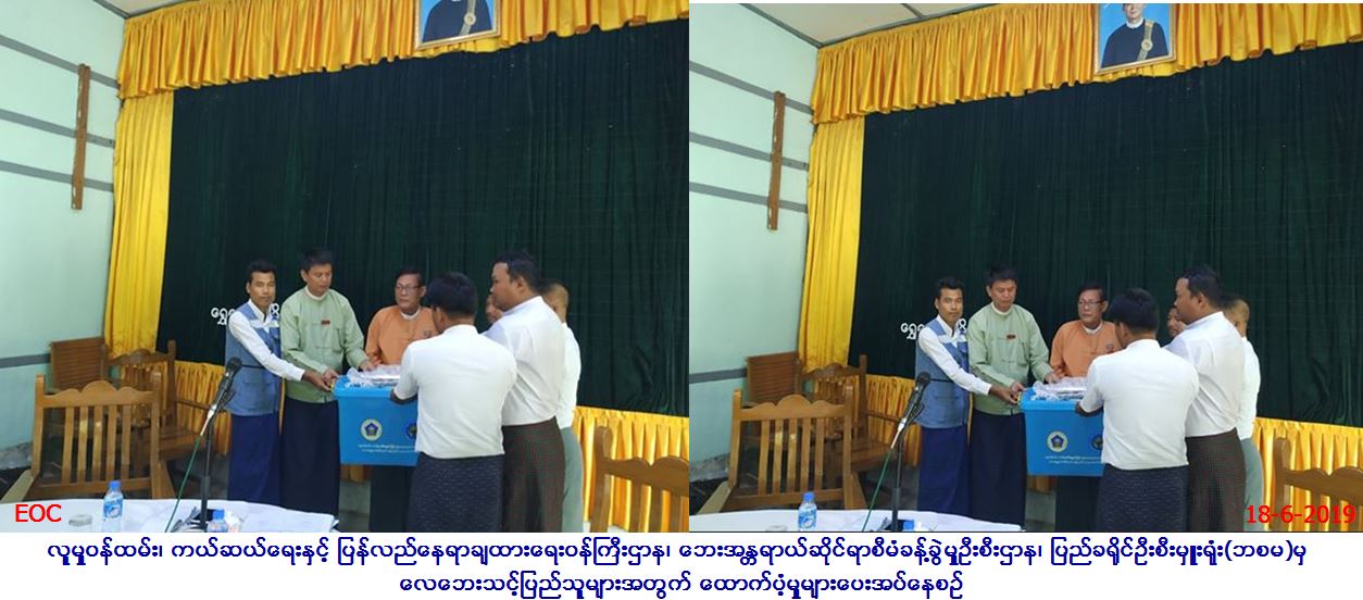 လူမှုဝန်ထမ်း ကယ်ဆယ်ရေးနှင့် ပြန်လည်နေရာချထားရေးဝန်ကြီးဌာန၊ ဘေးအန္တရာယ်ဆိုင်ရာစီမံခန့်ခွဲမှုဦးစီးဌာန၊ ပြည်ခရိုင်ဦးစီးမှူးရုံးမှ တာဝန်ရှိသူများသည် (၁၄.၆.၂၀၁၉)ရက်နေ့တွင် ရွှေတောင်မြို့နယ်၊ ကျေးရွာအုပ်စု (၄) စု၊ ကျေးရွာ (၅)ရွာ၌ ဖြစ်ပွားသော လေဘေးသင့် ပြိုလဲနေအိမ် (၂)လုံး၊ အမိုးလန်နေအိမ် (၄)လုံးနှင့် အိမ်ထောင်စု (၆)စုရှိ လူဦးရေ (၂၂)ဦးတို့အတွက် အိမ်ဆောက်ပစ္စည်းဖိုးနှင့် ဆန်ဖိုးထောက်ပံ့ငွေ (၂၄၆,၂၀၀)ကျပ်နှင့် ကယ်ဆယ်ရေးပစ္စည်း (၁၆)မျိုး ပလတ်စတစ်ပုံးအပါ (၂)ပုံးတို့ကို (၁၈.၆.၂၀၁၉)ရက်နေ့တွင် သွားရောက်ထောက်ပံ့ပေးအပ်ခဲ့ ပါကြောင်း သတင်းရရှိပါသည်။