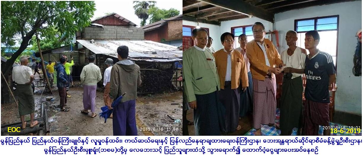လူမှုဝန်ထမ်း ကယ်ဆယ်ရေးနှင့် ပြန်လည်နေရာချထားရေးဝန်ကြီးဌာန၊ ဘေးအန္တရာယ်ဆိုင်ရာစီမံခန့်ခွဲမှုဦးစီးဌာန၊ မွန်ပြည်နယ်ဦးစီးမှူးရုံးမှ တာဝန်ရှိသူများသည် (၁၈.၆.၂၀၁၉)ရက်နေ့. နံနက် (၁၀း၀၀) နာရီအချိန်တွင် လေဆင်နှာမောင်းတိုက်ခတ်မှုကြောင့် မော်လမြိုင်မြို့နယ် ရိုးဂိုး ကျေးရွာအုပ်စု၊ မော်လမြိုင်-ကျိုက်က္ခမီလမ်းမဘေးရှိ Neo More ကုမ္ပဏီ Rc (၂) ထပ် အဆောက်အဦ၏ အမိုးသွပ်(၂၂၀)ခန့် လွင့်စင် ပျက်စီး ခြင်းနှင့် ရိုးဂိုးကျေးရွာအုပ်စု. ရိုးဂိုးရွာဟောင်းလမ်း ကျခပ်ချောင်းဘေးရှိ ပျဉ်ထောင်(၂)ထပ်နေအိမ်နောက်ပိုင်း၏ အမိုးသွပ်များ လွင့်စင် ပျက်စီး မှုဖြစ်ပွားခဲ့ပါသည်။ အဆိုပါ တစ်စိတ်တစ်ပိုင်းပျက်စီးနေအိမ်အတွက် မွန်ပြည်နယ်ဦးစီးမှူးရုံး(ဘစမ)မှ အိမ်ဆောက်ပစ္စည်းဖိုးငွေ (၁၀၀,၀၀၀/-) ကျပ်ကိုလည်းကောင်း၊ ပြည်နယ်ဝန်ကြီးချုပ်မှ ဘေးသင့်လူဦးရေ (၇)ဦးအတွက် (၇)ရက်စာ ဆန်ဖိုးငွေ(၁၅,၀၀၀)ကျပ်နှင့် အိမ်ဆောက်ပစ္စည်း ဖိုးငွေ (၅၀,၀၀၀)ကျပ်တို့ကို လည်းကောင်း ထောက်ပံ့ခဲ့ပါကြောင်း သတင်းရရှိပါသည်။