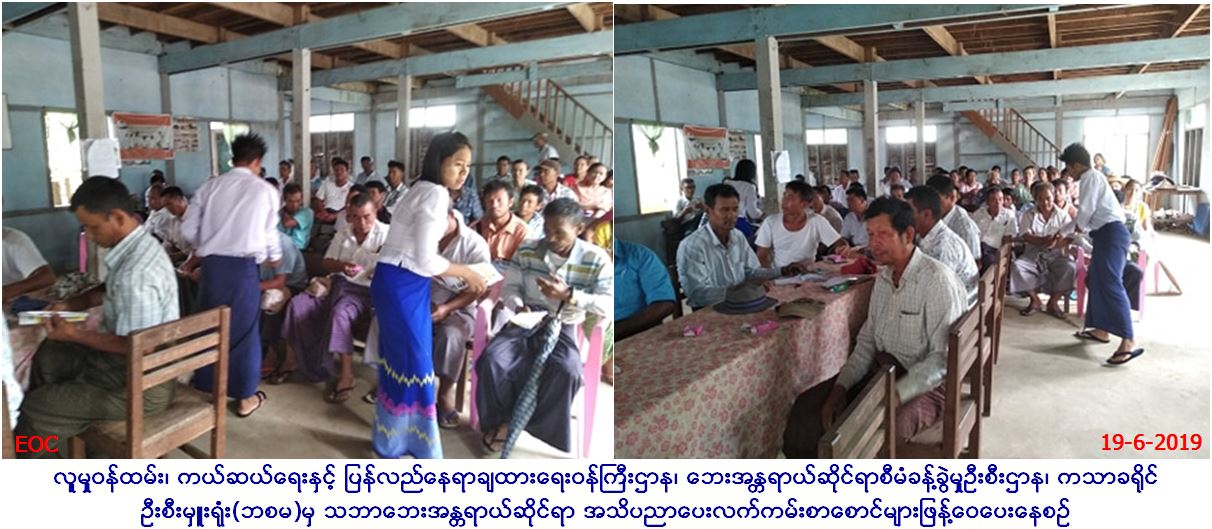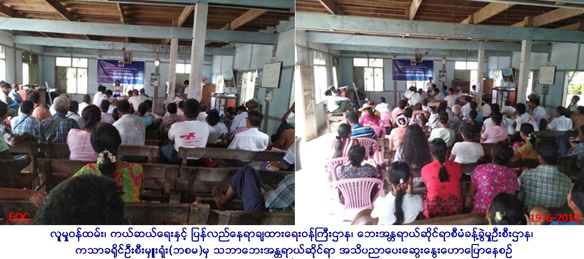 လူမှုဝန်ထမ်း၊ ကယ်ဆယ်ရေးနှင့် ပြန်လည်နေရာချထားရေးဝန်ကြီးဌာန၊ ဘေးအန္တရာယ်ဆိုင်ရာစီမံခန့်ခွဲမှုဦးစီးဌာန၊ ကသာခရိုင်ဦးစီးမှူးရုံးမှ တာဝန်ရှိသူများသည် (၁၉.၆.၁၉)ရက်နေ့၌ ကသာမြို့နယ်၊ ကျောင်ထုံးကြီးကျေးရွာတွင် ကျေးရွာသူ၊ ကျေးရွာသား(၉၀)ဦးခန့်ကို သဘာဘေး အန္တရာယ်ဆိုင်ရာ ဆောင်ရန်/ရှောင်ရန်များ အသိပညာပေးဆွေးနွေးဟောပြောခဲ့ပြီး လက်ကမ်းစာစောင်များဖြန့်ဝေပေးအပ်ခဲ့ပါကြောင်း သတင်း ရရှိပါသည်။