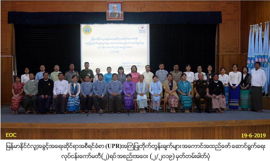 ပြည်ထောင်စုဝန်ကြီးက ညှိနှိုင်းဆွေးနွေးစကားပြောကြားရာတွင် UPR ဆိုသည်မှာ ကမ္ဘာ့နိုင်ငံအားလုံး၏ လူ့အခွင့်အရေးအခြေအနေကို ပုံမှန်သုံးသပ်ခြင်းလုပ်ငန်းစဉ်ဖြစ်ပါကြောင်း၊ ကုလသမဂ္ဂအဖွဲ့ဝင်နိုင်ငံများအနေဖြင့် မိမိတို့နိုင်ငံအလိုက် လူ့အခွင့်အရေးဆိုင်ရာ ဆောင်ရွက် ချက်များကိုတင်ပြ၍ သုံးသပ်မှုခံယူရန် နိုင်ငံအချင်းချင်းအကြံပြုကြခြင်းဖြစ်ပါကြောင်း၊ မြန်မာနိုင်ငံအနေဖြင့် အစီရင်ခံစာကို ၅ နှစ် တစ်ကြိမ် တင်သွင်းရာတွင် ၂၀၁၁ ခုနှစ် နှင့် ၂၀၁၅ ခုနှစ်တို့တွင် ပထမအကြိမ်၊ ဒုတိယအကြိမ်အစီရင်ခံစာတို့ကို လူ့အခွင့်အရေးဆိုင်ရာ မဟာမင်းကြီး ရုံးသို့ ပေးပို့တင်ပြခဲ့ပြီးဖြစ်ရာ ယခုတတိယအကြိမ်အစီရင်ခံစာကို ၂၀၂၀ ခုနှစ်၊ ဇူလိုင်လ နောက်ဆုံးထား၍ တင်သွင်းရမည်ဖြစ်ပါကြောင်း၊ မြန်မာနိုင်ငံ၏ ဒုတိယအကြိမ် အစီရင်ခံစာအပေါ် သုံးသပ်မှုခံယူခဲ့စဉ် အဖွဲ့ဝင်နိုင်ငံပေါင်း (၉၃) နိုင်ငံမှ အကြံပြုတိုက်တွန်းချက် (၂၈၁) ချက်အနက် မိမိတို့နိုင်ငံအနေဖြင့် အကြံပြုချက် (၁၆၆) ချက် လက်ခံခဲ့ပါကြောင်း၊ ထိုအကြံပြုချက် (၁၆၆) ရပ်အပေါ် အကောင်အထည် ဖော်ဆောင်ရွက်ရန် ကဏ္ဍ (၁၂) ရပ် ခွဲဝေထားရှိပြီး ကဏ္ဍ (၁၂) ရပ်အပေါ် ဆောင်ရွက်မည့်ဝန်ကြီးဌာန၊ အဖွဲ့အစည်းများကို သတ်မှတ်ခဲ့ရာမှာ မိမိတို့ဝန်ကြီးဌာန အနေဖြင့် ကဏ္ဍ(၂) ခုကို တာဝန်ယူထားရပါကြောင်း၊ အဆိုပါ ကဏ္ဍ (၂) ခုမှ ကျား/မ တန်းတူရည်တူရှိမှု မြှင့်တင်ရေးကိစ္စနှင့် ထိခိုက်ခံစားလွယ်သောအုပ်စုများ ကာကွယ်ရေးဆိုင်ရာ အကြံပြုချက်များနှင့် ခွဲခြားမှုမပြုရေးကိစ္စဆိုင်ရာ အကြံပြုချက် များကို အကောင် အထည်ဖော်ဆောင်ရွက်ရန် လုပ်ငန်းကော်မတီ (၂) ရပ် ဖွဲ့စည်းဆောင်ရွက်လျက်ရှိပါကြောင်း၊ အမျိုးသားအဆင့်ကော်မတီ၏ ဒုတိယအကြိမ် ညှိနှိုင်းအစည်းအဝေးတွင် လုပ်ငန်းကော်မတီများက ကဏ္ဍအသီးသီးဆိုင်ရာ ဖော်ဆောင်မှုများကို အရှိန်အဟုန်မြှင့် ဆောင်ရွက်ရန်၊ ဆက်လက် ဆောင်ရွက်ရန်အချက်များကိုလည်း သတ်မှတ်ချိန်အတွင်း ပြီးစီးနိုင်ရေးအတွက် တာဝန်ခံဝန်ကြီးဌာနများ၊ အဖွဲ့အစည်းများနှင့် ပူးပေါင်းညှိနှိုင်းပြီး အလေးထား ဆောင်ရွက်သွား ရန်နှင့် ဩဂုတ်လတွင် အစီရင်ခံစာပြုစု ရေးလုပ်ငန်းကော်မတီသို့ ပေးပို့သွားရန် ညွှန်ကြားမှုရရှိပြီးဖြစ်ပါကြောင်း၊ အစီရင်ခံစာပြုစုရေးလုပ်ငန်းကော်မတီက ပေးပို့သည့်ပုံစံများနှင့်အညီ မိမိတို့လုပ်ငန်းကော်မတီများအနေဖြင့် အစီရင်ခံစာမူကြမ်းကို ပြုစုရမည် ဖြစ်ပါကြောင်း၊ ကော်မတီအဖွဲ့ဝင်များ၏ ဆောင်ရွက်ထားရှိမှု ရလာဒ်များကို ကိန်းဂဏန်း စာရင်းအချက်အလက်များဖြင့် ရေးသားပြုစုပြီး ကောင်းမွန်သည့် အစီရင်ခံစာတစ်ခု ဖြစ်မြောက်လာရန် အားလုံးပူးပေါင်းပါဝင် ဆောင်ရွက်ပေ