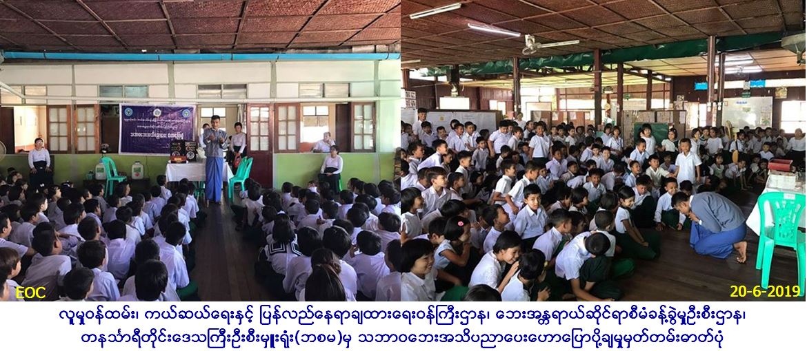 လူမှုဝန်ထမ်း၊ ကယ်ဆယ်ရေးနှင့် ပြန်လည်နေရာချထားရေးဝန်ကြီးဌာန၊ ဘေးအန္တရာယ်ဆိုင်ရာစီမံခန့်ခွဲမှုဦးစီးဌာန၊ တနင်္သာရီတိုင်းဒေသကြီး ဦးစီးမှူးရုံးမှ တာဝန်ရှိသူများသည် (၂၀-၆-၂၀၁၉) ရက်နေ့ (၁၀း၀၀) နာရီအချိန်တွင် ထားဝယ်ခရိုင်၊ ထားဝယ်မြို့နယ်၊ ဇရစ်ရပ်ကွက် အ.မ.က.ဇရစ်၌ လူဦးရေ (၂၀၀)ကျော်အား သဘာဝဘေးအသိပညာပေးဟောပြောဆွေးနွေးခဲ့ကြောင်း သတင်းရရှိပါသည်။