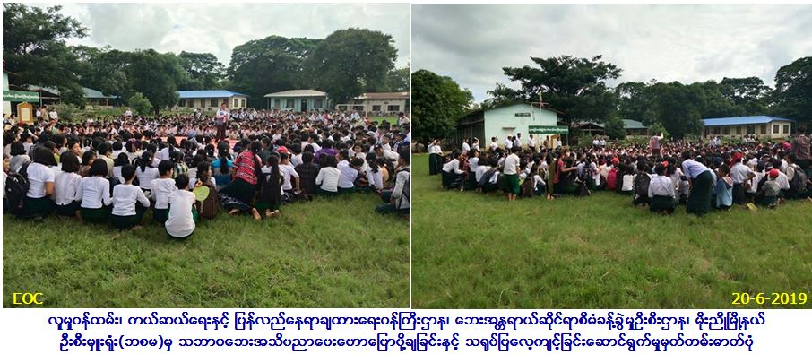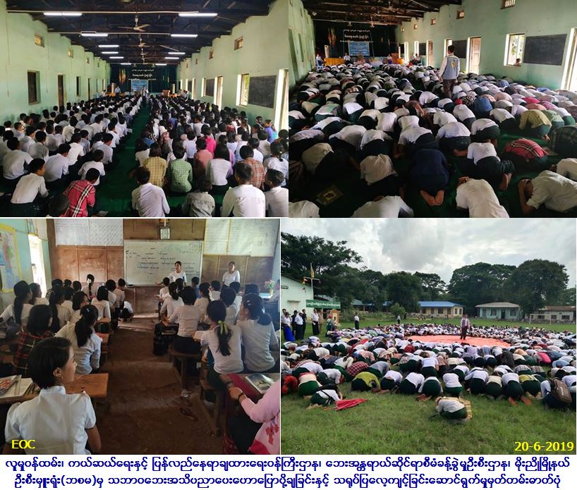 လူမှုဝန်ထမ်း၊ ကယ်ဆယ်ရေးနှင့် ပြန်လည်နေရာချထားရေးဝန်ကြီးဌာန၊ ဘေးအန္တရာယ်ဆိုင်ရာစီမံခန့်ခွဲမှုဦးစီးဌာန၊ မိုးညိုမြို့နယ်ဦးစီးမှူးရုံးမှ တာဝန်ရှိသူများသည် (၂၀-၆-၂၀၁၉)ရက်နေ့ (၁၃း၀၀)နာရီအချိန်တွင် မိုးညိုမြို့နယ်အတွင်းရှိ အခြေခံပညာအထက်တန်းကျောင်း အ.ထ.က-ထိန်တောတွင် ကျောင်းတွင်းအခြေပြု သဘာဝဘေးအန္တရာယ်ဆိုင်ရာအသိပညာပေး ဆွေးနွေးဟောပြောပွဲနှင့် သရုပ်ပြလေ့ကျင့်ခြင်း အစီ အစဉ်ကိုကျင်းပခဲ့ရာ ပထမဦးစွာရွေးချယ်ထားသော ကျောင်းသား၊ ကျောင်းသူ(၂၅၀)ဦးအား သဘာဝဘေးအန္တရယ်ဆိုင်ရာ အသိပညာပေး ဆင့်ပွားသင်တန်းပေးခဲ့ပြီး ၎င်းသင်တန်းသားများ ပူးပေါင်းပါဝင်၍ ဆရာ၊ ဆရာမများနှင့် ကျောင်သား၊ ကျောင်းသူ(၂၀၀၀)ဦးခန့် တစ်ကျောင်း လုံးအတိုင်းအတာဖြင့် ငလျင်သရုပ်ပြလေ့ကျင့်ခြင်းများဆောင်ရွက်ခဲ့ပြီး လက်ကမ်းစာစောင်များနှင့် ပိုစတာများဖြန့်ဝေပေးခဲ့ပါကြောင်း သတင်း ရရှိပါသည်။