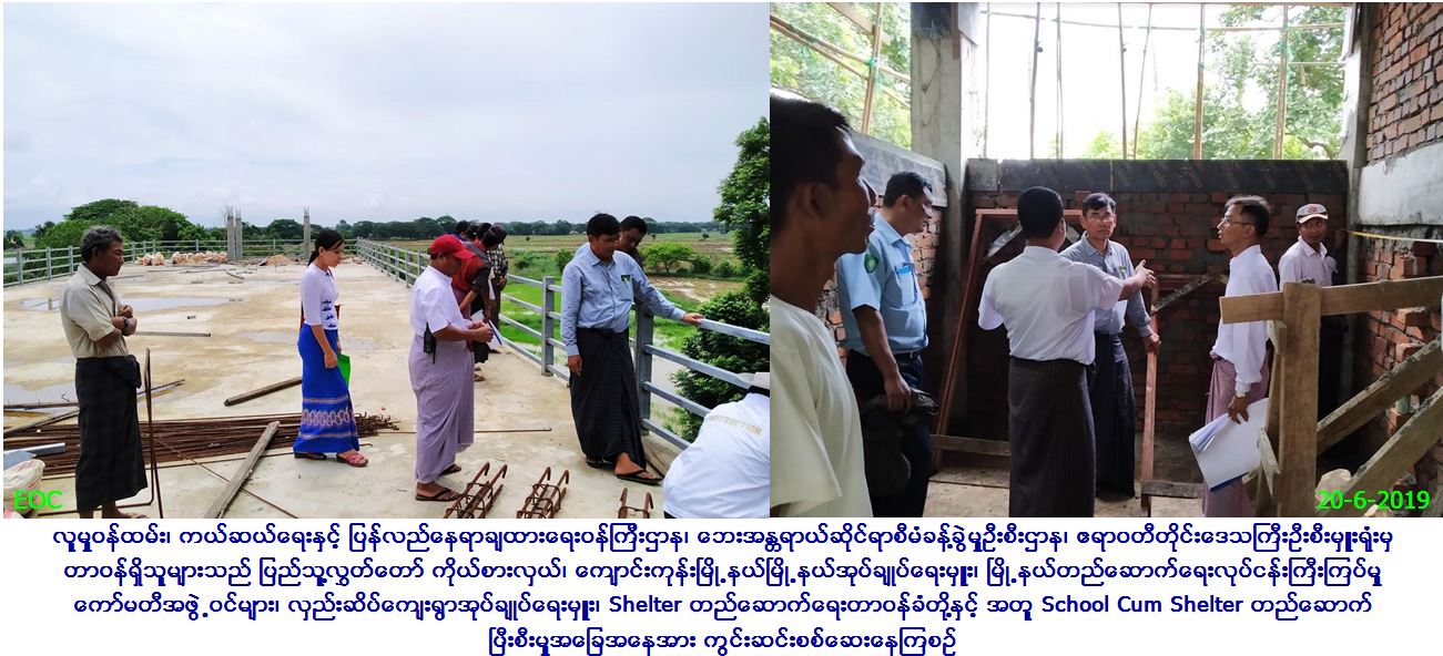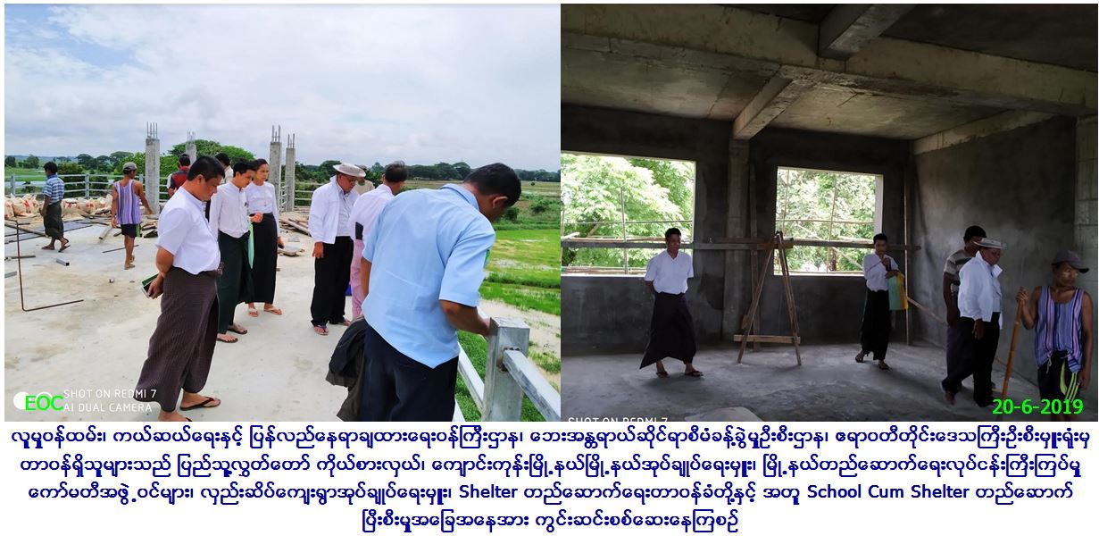 လူမှုဝန်ထမ်း၊ ကယ်ဆယ်ရေးနှင့် ပြန်လည်နေရာချထားရေးဝန်ကြီးဌာန၊ ဘေးအန္တရာယ်ဆိုင်ရာစီမံခန့်ခွဲမှုဦးစီးဌာန၊ ဧရာဝတီတိုင်းဒေသကြီး ဦးစီးမှူးရုံးမှ တာဝန်ရှိသူများသည် (၂၀-၆-၂၀၁၉)ရက်နေ့၌ ကျောင်းကုန်းမြို့နယ်၊ လှည်းဆိပ်ကျေးရွာအုပ်စု၊ အပင်နှစ်ဆယ် ကျေးရွာတွင် ဆောက်လုပ်လျက်ရှိသည့် School Cum Shelter (၇၅%) တည်ဆောက်ပြီးစီးမှုအခြေအနေအား ပြည်သူ့လွှတ်တော် ကိုယ်စားလှယ်၊ ကျောင်း ကုန်းမြို့နယ် မြို့နယ်အုပ်ချုပ်ရေးမှူး၊ မြို့နယ်တည်ဆောက်ရေးလုပ်ငန်းကြီးကြပ်မှုကော်မတီအဖွဲ့ဝင်များ၊ လှည်းဆိပ်ကျေးရွာအုပ်ချုပ်ရေးမှူး၊ Shelter တည်ဆောက်ရေးတာဝန်ခံတို့နှင့်အတူ ကွင်းဆင်းစစ်ဆေးခဲ့ပါကြောင်း သတင်းရရှိပါသည်။