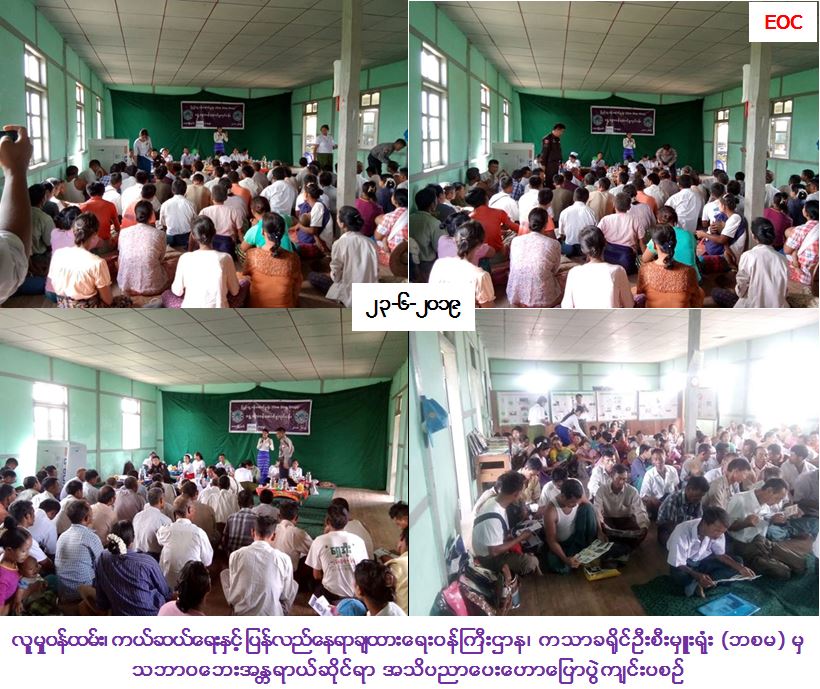 လူမှုဝန်ထမ်း၊ ကယ်ဆယ်ရေးနှင့်ပြန်လည်နေရာချထားရေးဝန်ကြီးဌာန၊ ဘေးအန္တရာယ်ဆိုင်ရာ စီမံခန့်ခွဲမှုဦးစီးဌာန၊ ကသာခရိုင်ဦးစီးမှူးရုံးမှ တာဝန်ရှိသူများသည် (၂၂-၆-၂၀၁၉) ရက်နေ့တွင် ပြည်သူ့ဝန်ဆောင်မှုရုံး (OSS) အဖွဲ့နှင့်ပူးပေါင်း၍ ကသာမြို့နယ်၊ ပုလွေရွှေ ကျေးရွာ၌ သဘာဝဘေးအန္တရာယ်ဆိုင်ရာ အသိပညာပေးဟောပြောပွဲ ကျင်းပပြုလုပ်ခဲ့ရာ ဦးစီးဌာန၏ လုပ်ငန်းဆောင်ရွက်မှုများ၊ ရာသီဥတုပြောင်းလဲခြင်းနှင့် ၄င်း၏ သက်ရောက်မှု များကြောင့် ဖြစ်ပွားတတ်သော သဘာဝဘေးအန္တရာယ်များအကြောင်း၊ မိုးကြိုးဘေးနှင့် ပတ်သက်၍ ဆောင်ရန်/ရှောင်ရန်များကို ဆွေးနွေးဟောပြောခဲ့ပြီး တက်ရောက်လာသူ များအား လက်ကမ်းစာစောင်များ ဖြန့်ဝေခြင်းတို့ပြုလုပ်ခဲ့ပါကြောင်း သတင်းရရှိပါသည်။