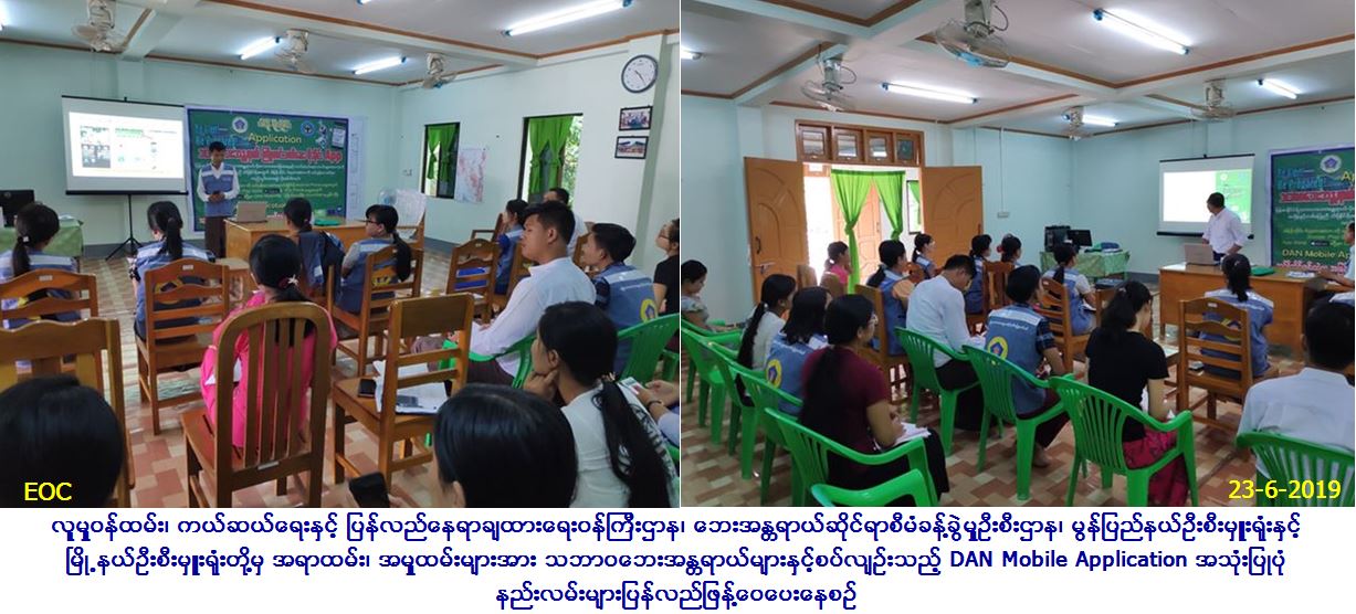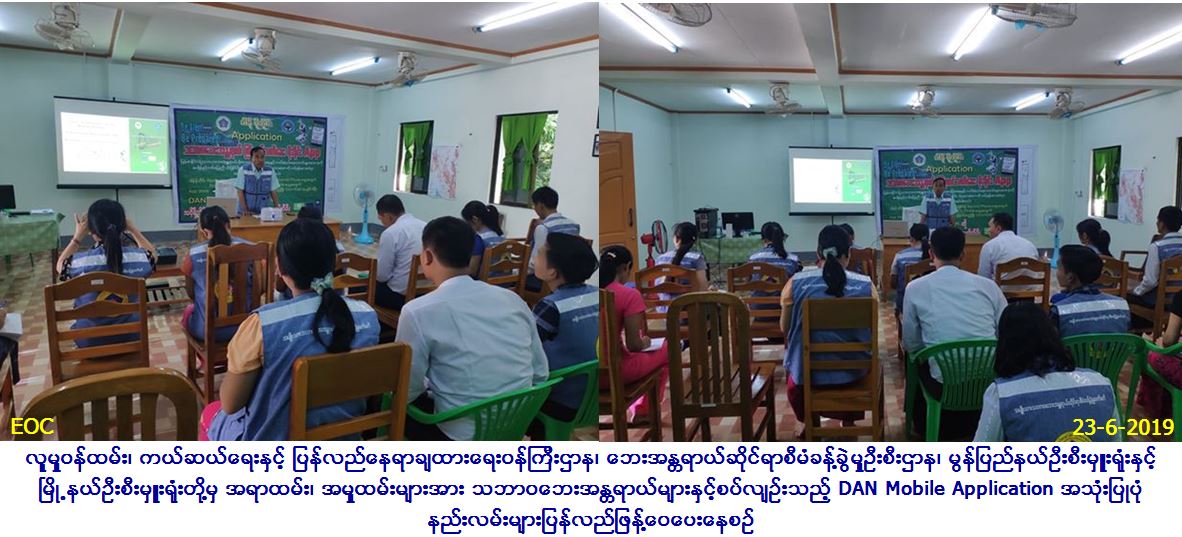 (၂၃.၆.၂၀၁၉)ရက်နေ့ နံနက်(၀၉း၀၀)နာရီအချိန်မှ (၁၂း၀၀)နာရီအချိန်အထိ မွန်ပြည်နယ်ဦးစီးမှူးရုံး အစည်းအဝေးခန်းမ၌ လူမှုဝန်ထမ်း၊ ကယ်ဆယ်ရေးနှင့်ပြန်လည်နေရာချထားရေးဝန်ကြီးဌာန၊ ဘေးအန္တရာယ်ဆိုင်ရာစီမံခန့်ခွဲမှုဦးစီးဌာန၊ မွန်ပြည်နယ်ဦးစီးမှူးရုံးနှင့် မြို့နယ်ဦးစီးမှူး ရုံးတို့မှ အရာထမ်း၊ အမှုထမ်းအင်အား (၂၅)ဦးတို့ဖြင့် သဘာဝဘေးအန္တရာယ်များနှင့်စပ်လျဉ်းသည့် ပြည်သူများထံ ကြိုတင်သတိပေးချက်များ အချိန်နှင့်တပြေးညီပေးပို့နိုင်ရေးနှင့် ကြိုတင်ပြင်ဆင်မှုများဆောင်ရွက်နိုင်ကြစေရန်ရည်ရွယ်ထုတ်လုပ်ထားသည့် DAN Mobile Application အသုံးပြုပုံနည်းလမ်းများအား ပြည်သူများထံ ကျယ်ကျယ်ပြန့်ပြန့် ဖြန့်ဝေပေးနိုင်ရေးအတွက် ကြိုတင်ပြင်ဆင်လေ့ကျင့်မှုများ ဆောင်ရွက်ခဲ့ပါ ကြောင်း သတင်းရရှိပါသည်။
