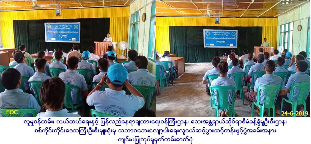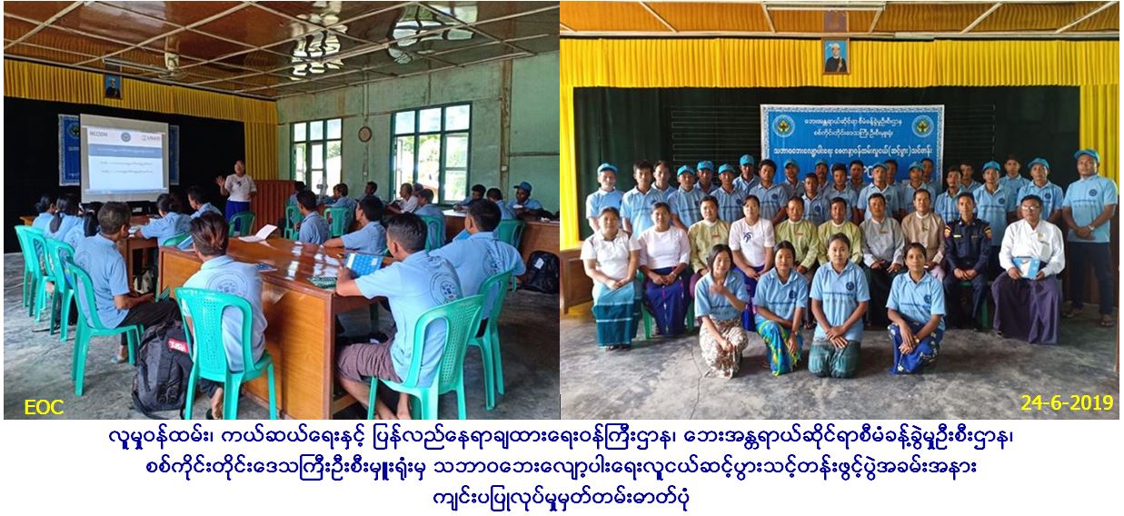 လူမှုဝန်ထမ်း ကယ်ဆယ်ရေးနှင့် ပြန်လည်နေရာချထားရေးဝန်ကြီးဌာန၊ ဘေးအန္တရာယ်ဆိုင်ရာစီမံခန့်ခွဲမှုဦးစီးဌာန၊ စစ်ကိုင်းတိုင်းဒေသကြီး ဦးစီးမှူးရုံးမှ တာဝန်ရှိသူများသည် တမူးခရိုင်၊ တမူးမြို့နယ်၊ အထွေထွေအုပ်ချုပ်ရေးဦးစီးဌာနအစည်းအဝေးခန်းမ၌ (၂၄-၆-၂၀၁၉) ရက်နေ့၊ နံနက် (၀၉:၀၀) နာရီအချိန်တွင် သဘာဝဘေးလျော့ပါးရေးလူငယ်ဆင့်ပွားသင့်တန်းဖွင့်ပွဲအခမ်းအနားအား ကျင်းပပြုလုပ်ခဲ့ရာ ဌာနဆိုင်ရာ များမှ တာဝန်ရှိသူများ၊ ရပ်မိ/ရပ်ဖများ၊ သင်တန်းသား/သူ (၃၀)ဦးတက်ရောက်ခဲ့ပြီး တက်ရောက်လာသူများအား သဘာဝ ဘေးအန္တရာယ် ဆိုင်ရာ ဝေါဟာရများနှင့် သဘာဝဘေးအန္တရာယ်များအကြောင်း ဟောပြောပို့ချခြင်း၊ တီရှပ်၊ မိုးကာ၊ ဦးထုပ်၊ ဓာတ်မီး စသည့် သင်တန်းသုံး ပစ္စည်းများဖြည့်ဝေပေးခြင်းတို့ဆောင်ရွက်ခဲ့ပါသည်။ သင်တန်းကာလမှာ (၂၄-၆-၂၀၁၉) ရက်နေ့မှ (၂၆-၆-၂၀၁၉) ရက်နေ့ထိ (၃) ရက်ကြာ ကျင်းပပြုလုပ်သွားမည်ဖြစ်ပါကြောင်း သတင်းရရှိပါသည်။
