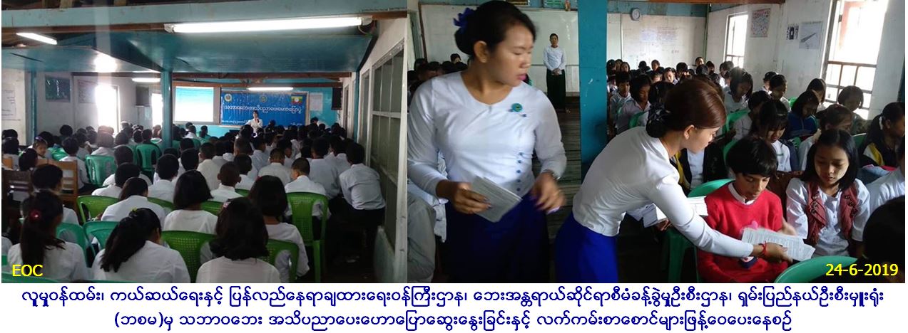 လူမှုဝန်ထမ်း ကယ်ဆယ်ရေးနှင့် ပြန်လည်နေရာချထားရေးဝန်ကြီးဌာန၊ ဘေးအန္တရာယ်ဆိုင်ရာစီမံခန့်ခွဲမှုဦးစီးဌာန၊ ရှမ်းပြည်နယ်ဦးစီးမှူးရုံးမှ တာဝန်ရှိသူများသည် (၂၄.၆.၂၀၁၉)ရက်နေ့ နံနက်ပိုင်းတွင် တောင်ကြီးမြို့နယ် အလက(၄)၌ကျောင်းသား၊ ကျောင်းသူ (၃၀၀)ဦးအား သဘာဝဘေးအသိပညာပေးဟောပြောပွဲပြုလုပ်ခဲ့ရာ လက်ကမ်းစာစောင်များဖြန့်ဝေခြင်းနှင့် ပညာပေးဗီဒီယိုပြသခြင်းများဆောင်ရွက်ခဲ့ပါ ကြောင်း သတင်းရရှိပါသည်။