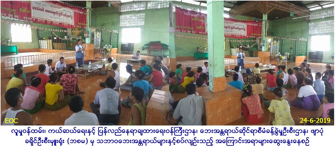 လူမှုဝန်ထမ်း ကယ်ဆယ်ရေးနှင့် ပြန်လည်နေရာချထားရေးဝန်ကြီးဌာန၊ ဘေးအန္တရာယ်ဆိုင်ရာစီမံခန့်ခွဲမှုဦးစီးဌာန၊ ဖျာပုံခရိုင်ဦးစီးမှူးရုံးမှ တာဝန်ရှိသူများသည် (၂၄-၆-၂၀၁၉)ရက်နေ့တွင် ဒေးဒရဲမြို့နယ်၊ အုန်းပင်ကျေးရွာအုပ်စု၊ အုန်းပင်ကျေးရွာ၊ ရွာလယ်ဘုန်းတော်ကြီးကျောင်း၌ ကျေးရွာသူရွာသား (၆၀)ဦးအား သဘာဝဘေးလျော့ပါးအသိပညာပေးဟောပြောပွဲကျင်းပပြုလုပ်ခဲ့ရာ ဘေးနှင့် ပတ်သက်သည့် ဆောင်ရန်/ ရှောင်ရန်အချက်များဆွေးနွေးခဲ့ပြီး လက်ကမ်းစာစောင်များဖြန့်ဝေပေးခဲ့ကြောင်း သတင်းရရှိပါသည်။