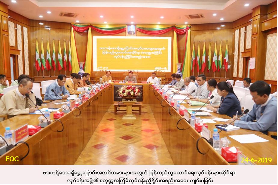 လူမှုဝန်ထမ်း၊ ကယ်ဆယ်ရေးနှင့်ပြန်လည်နေရာချထားရေးဝန်ကြီးဌာန၊ ပြည်ထောင်စုဝန်ကြီး၊ ဒေါက်တာဝင်းမြတ်အေးက ဖားကန့်ဒေသ တရား ဥပဒေစိုးမိုးရေး၊ သဘာဝပတ်ဝန်းကျင် ထိန်းသိမ်းရေး၊ မြေယာစီမံခန့်ခွဲရေးနှင့် အသက်မွေးဝမ်းကျောင်းသင်တန်းပေးရေးနှင့် အလုပ်အကိုင်ရှာဖွေပေးရေး တို့နှင့်ပတ်သက်၍ လုပ်ဆောင်နေမှုများကို လုပ်ငန်းစီမံချက်များ ရေးဆွဲအကောင်အထည်ဖော်ရန် တာဝန်ရှိပါကြောင်း၊ ယခုအစည်းအဝေးတွင် ရှေ့ဆက်မည်သို့ ဆက်လက်ဆောင်ရွက်ကြရမည်ကို ဆွေးနွေးကြရမည်ဖြစ်ပါကြောင်း အစိုးရ၏ကြိုးပမ်း ချက်များ အောင်မြင်ရန်အတွက် ကျယ်ပြန့်စွာ ပညာပေးရန်နှင့်လုပ်ငန်းအဖွဲ့ခွဲများအကြား၊ သက်ဆိုင်ရာအစိုးရဌာန များအကြား၊ ပြည်နယ်အစိုးရနှင့် ပြည်ထောင်စုအစိုးရအကြား ပူးပေါင်းဆောင်ရွက်ရန် လိုအပ်မည်ဖြစ်ကြောင်း၊ ဒေသခံများ၏ ဝိုင်းဝန်းအားပေး ကူညီမှုများလည်း အရေးကြီးပါကြောင်း၊ (၁၂-၆-၂၀၁၉) ရက်နေ့တွင်ကျင်းပခဲ့သော လုံခြုံရေး၊ တည်ငြိမ်အေးချမ်းရေးနှင့် တရားဥပဒေစိုးမိုးရေးကော်မတီအစည်းအဝေးမှ ညှိနှိုင်းဆုံးဖြတ်ချက်များ ချမှတ်ခဲ့ပါကြောင်း၊ ၎င်းတို့မှာ ဖားကန့်ဒေသတွင် တရားဥပဒေစိုးမိုးရေးသည် အရေးကြီးဆုံး ဖြစ်ကြောင်း၊ ရွှေ့ပြောင်းအလုပ်သမားများအား စစ်တမ်းကောက်ယူခြင်း၊ ဒေသခံတာဝန်ရှိသူများနှင့် ဆွေးနွေး ညှိနှိုင်း၍ အမြန်ဆုံး စစ်တမ်းကောက်ယူနိုင်ရေး ဖားကန့်ဒေသရှိ ရွှေ့ပြောင်း အလုပ်သမားများ၊ ရေမဆေးသမားများကို စနစ်တကျ၊ သတ်မှတ်ထားသော ဥပဒေနှင့်အညီ ဆောင်ရွက်ရေး၊ မူးယစ်ဆေးတိုက်ဖျက်ရာတွင် ဒေသခံအဖွဲ့အစည်းများနှင့်ပူးပေါင်းပြီး အထူးစစ်ဆင်ရေးတစ်ရပ်အဖြစ် ဆောင်ရွက် နိုင်ရေး၊ ယမ်းအမြောက်များသုံစွဲသည့် ကုမ္ပဏီများစည်းကမ်းလိုက်နာရေး၊ ပြန်လည်ထူထောင်ရေးလုပ်ငန်းများတွင် ပူးပေါင်းဆောင်ရွက်နိုင်ရန် ညှိနှိုင်းဆောင်ရွက်နိုင်ရေး၊ ရွှေ့ပြောင်းအလုပ်သမားများအတွက် ယာယီနေရာချထားမှုကို စီမံချက်ရေးဆွဲနိုင်ရေး၊ သက်တမ်းကုန်လုပ်ကွက်များတွင် အပင်ပြန်လည် ပြုစုပျိုးထောင်ခြင်း မဖြစ်မနေ ဆောင်ရွက်ရန် ကြိုးပမ်းရေး၊ သဘာဝဘေးအန္တရာယ် ကျရောက်နိုင်သည့်အတွက် ဥရုချောင်းရေစီးရေလာ ကောင်းမွန်စေရေးအတွက် လုပ်ငန်းရှင်များ၊ ဒေသခံများနှင့် ပူးပေါင်း ဆောင်ရွက်နိုင်ရေး၊ ကျောက်အချောထည်လုပ်ငန်းများ ကျယ်ကျယ်ပြန့်ပြန့် ဆောင်ရွက်နိုင်ရေးတို့ကို ပေါင်းဆောင်ရွက်ပေးစေလိုပါကြောင်း၊ ရှေ့လုပ်ငန်းစဉ်များကိုလည်း ဝိုင်းဝန်းဆွေးနွေး ပေးစေလိုကြောင်းဖြင့် ပြောကြား ခဲ့ပါသည်။