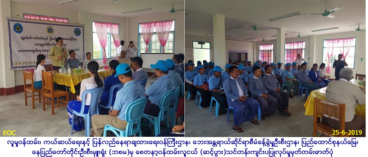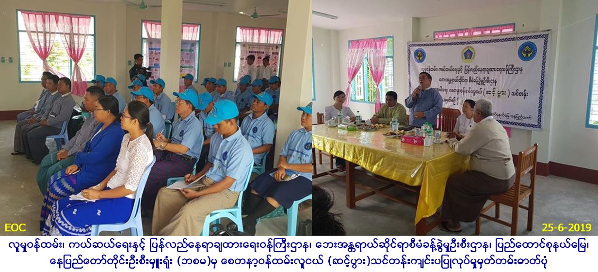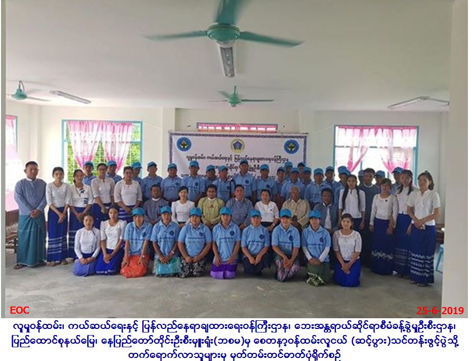 လူမှုဝန်ထမ်း၊ ကယ်ဆယ်ရေးနှင့် ပြန်လည်နေရာချထားရေးဝန်ကြီးဌာန၊ ဘေးအန္တရာယ်ဆိုင်ရာစီမံခန့်ခွဲမှုဦးစီးဌာန၊ ပြည်ထောင်စုနယ်မြေ၊ နေပြည်တော်တိုင်းဦးစီးမှူးရုံးမှ တာဝန်ရှိသူများသည် (၂၅.၆.၂၀၁၉)နေ့ (၀၉း၀၀)နာရီအချိန်တွင် ဒက္ခိဏခရိုင်၊ ပြန်ကြားရေးနှင့် ပြည့်သူ့ ဆက်ဆံရေးဦးစီးဌာနအစည်းအဝေးခန်းမ၌ စေတနာ့ဝန်ထမ်းလူငယ် (ဆင့်ပွား)သင်တန်း (၂/၂၀၁၉)ကို ဖွင့်လှစ်ခဲ့ရာ သင်တန်းဖွင့်ပွဲအခမ်းအနား သို့ ပြန်ကြားရေးနှင့်ပြည်သူ့ဆက်ဆံရေးဦးစီးဌာနမှ တိုင်းဦးစီးမှူး၊ ဇမ္ဗူသီရိမြို့နယ်အထွေထွေအုပ်ချုပ်ရေးဦးစီးဌာနမှ မြို့နယ်အုပ်ချုပ်ရေးမှူးနှင့် ကြက်ခြေနီကြီးကြပ်မှုကော်မတီမှ ဥက္ကဌ၊ သင်တန်းသား၊ သင်တန်းသူ (၃၀)ဦးတို့ တက်ရောက်ခဲ့ပြီး သင်တန်းကာလမှာ (၂၅-၆-၂၀၁၉)ရက်နေ့မှ (၂၇-၆-၂၀၁၉)ရက်နေ့အထိ (၃)ရက်တာကြာမြင့်မည်ဖြစ်ကြောင်း သတင်းရရှိပါသည်။