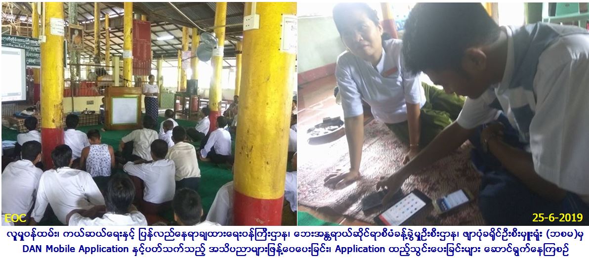 လူမှုဝန်ထမ်း၊ ကယ်ဆယ်ရေးနှင့် ပြန်လည်နေရာချထားရေးဝန်ကြီးဌာန၊ ဘေးအန္တရာယ်ဆိုင်ရာစီမံခန့်ခွဲမှုဦးစီးဌာန၊ ဖျာပုံခရိုင်ဦးစီးမှူးရုံးမှ တာဝန်ရှိသူများသည် (၂၅-၆-၂၀၁၉) ရက်နေ့တွင် ဒေးဒရဲမြို့နယ်၊ နောက်ပြန်တိုးကျေးရွာအုပ်စု၊ နောက်ပြန်တိုးကျေးရွာ၊ ဘုန်းတော်ကြီး ကျောင်းတွင် ရာအိမ်မှူးများစွမ်းဆောင်ရည်မြှင့်တင်ရေးသင်တန်းတွင် ရာအိမ်မှူးများအား DAN Mobile Application သုံးစွဲပုံနည်းစနစ်များကို ရှင်းလင်းပြောကြားခဲ့ပြီး တယ်လီဖုန်းများတွင် ထည့်သွင်းပေးခဲ့ရာလူဦးရေ (၁၀၀) ဦးခန့် စိတ်ပါဝင်စားစွာနားထောင်ခဲ့ကြပါကြောင်း သတင်း ရရှိပါသည်။