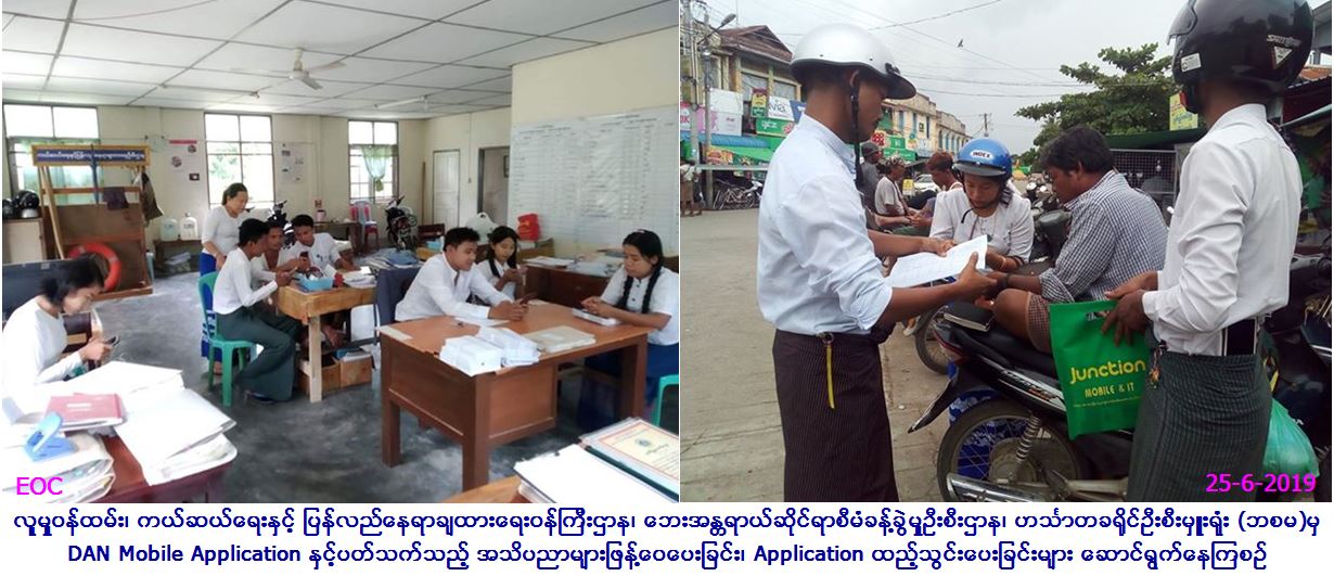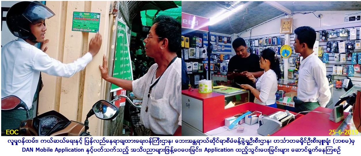 လူမှုဝန်ထမ်း၊ ကယ်ဆယ်ရေးနှင့် ပြန်လည်နေရာချထားရေးဝန်ကြီးဌာန၊ ဘေးအန္တရာယ်ဆိုင်ရာစီမံခန့်ခွဲမှုဦးစီးဌာန၊ ဟင်္သာတခရိုင်ဦးစီးမှူးရုံးမှ တာဝန်ရှိသူများသည် (၂၅-၆-၂၀၁၉)ရက်နေ့တွင် ဟင်္သာတခရိုင်၊ ဟင်္သာတမြို့နယ်ရှိ ရုံးဝန်ထမ်းများ၊ mobile phone ဆိုင်များ၊ ကားဂိတ်များနှင့် ဈေးများတွင် DAN Mobile Application သုံးစွဲပုံ နည်းစနစ်များကိုရှင်းလင်းပြောကြားခဲ့ပြီး တယ်လီဖုန်းများထဲသို့ DAN Mobile Application ထည့်သွင်းပေးခြင်း၊ ကြော်ငြာစာစောင်များကိုလူစည်ကားရာနေရာများ၌ ကပ်ပေးခြင်းများဆောင်ရွက်ခဲ့ပါကြောင်း သတင်းရရှိပါသည်။
