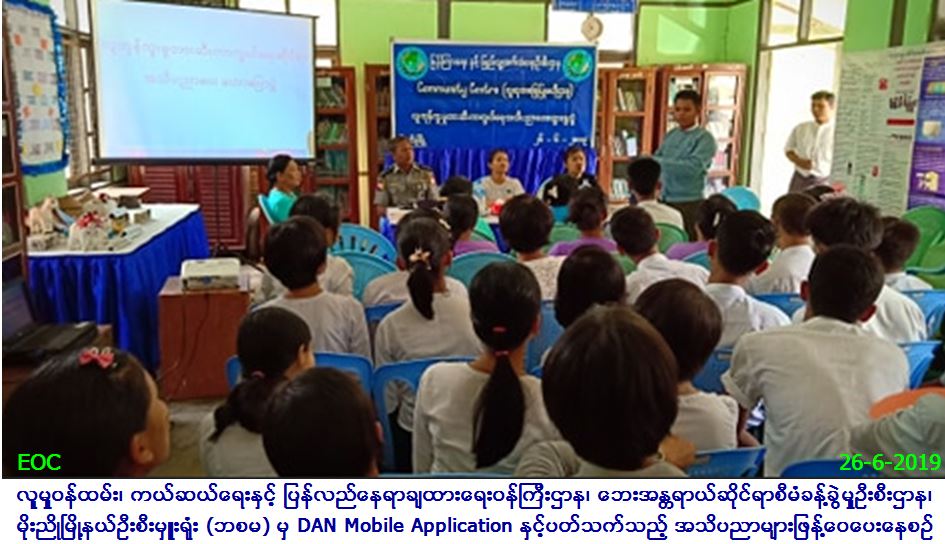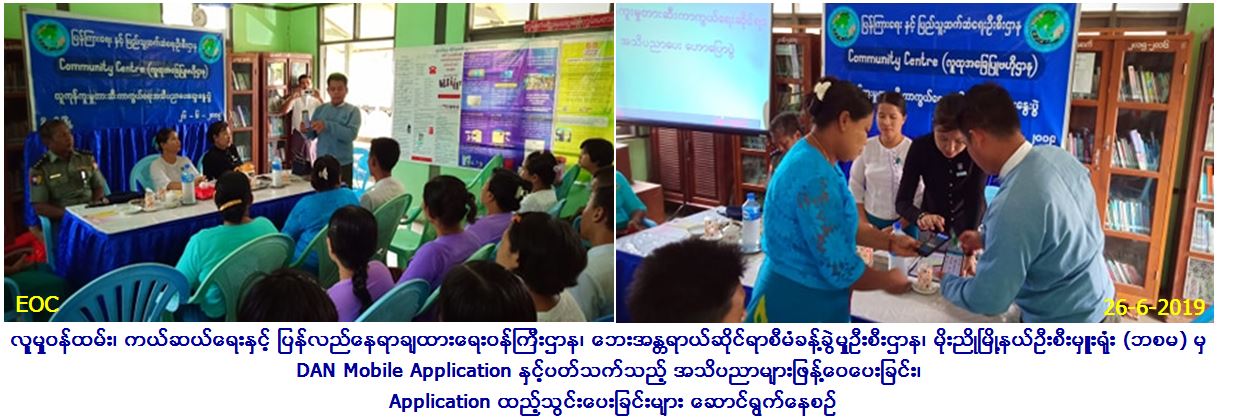 လူမှုဝန်ထမ်း၊ ကယ်ဆယ်ရေးနှင့် ပြန်လည်နေရာချထားရေးဝန်ကြီးဌာန၊ ဘေးအန္တရာယ်ဆိုင်ရာစီမံခန့်ခွဲမှုဦးစီးဌာန၊ မိုးညိုမြို့နယ်ဦးစီးမှူးရုံးမှ တာဝန်ရှိသူများသည် (၂၆.၆.၂၀၁၉)ရက်နေ့ နံနက်(၉း၃၀)နာရီအချိန်တွင် မိုးညိုမြို့နယ်ပြန်ကြားရေးနှင့်ပြည်သူ့ဆက်ဆံရေးဦးစီးဌာနမှ ကြီးမှူး ကျင်းပသော Community Centre (လူထုအခြေပြုဗဟိုဌာန)၌ ကျင်းပသော လူကုန်ကူးမှု တားဆီးကာကွယ်ရေး အသိပညာပေးဆွေးနွေးပွဲ သို့ တက်ရောက်လာသူ (၅၅) ဦးအား DAN Mobile Application သုံးစွဲပုံ နည်းစနစ်များကိုရှင်းလင်းပြောကြားခဲ့ပြီး တယ်လီဖုန်းများထဲသို့ DAN Mobile Application ထည့်သွင်းပေးခြင်းများဆောင်ရွက်ခဲ့ပါကြောင်း သတင်းရရှိပါသည်။