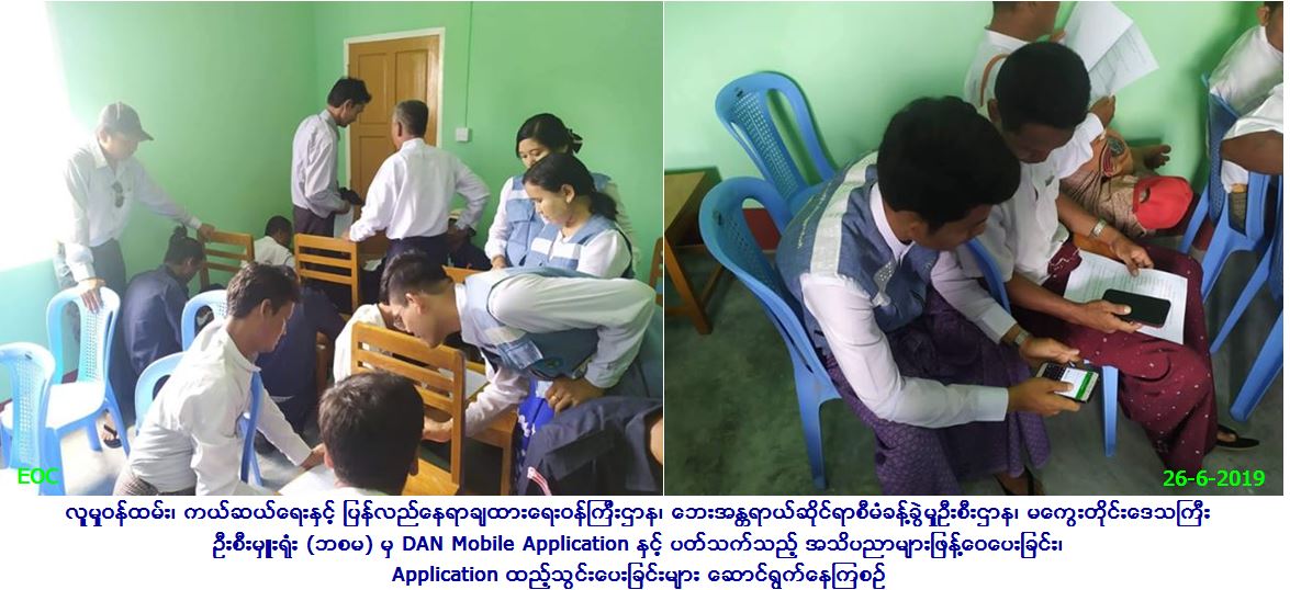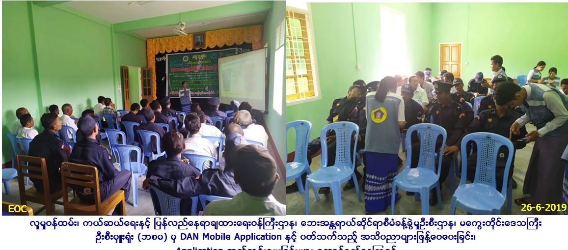 လူမှုဝန်ထမ်း၊ ကယ်ဆယ်ရေးနှင့် ပြန်လည်နေရာချထားရေးဝန်ကြီးဌာန၊ ဘေးအန္တရာယ်ဆိုင်ရာစီမံခန့်ခွဲမှုဦးစီးဌာန၊ မကွေးတိုင်းဒေသကြီးဦးစီး မှူးရုံးမှ တာဝန်ရှိသူများသည် (၂၆-၆-၂၀၁၉) ရက်နေ့တွင် မင်းဘူးခရိုင်၊ မင်းဘူးမြို့နယ်ဦးစီးမှူးရုံး အစည်းအဝေးခန်းမ၌ ကျေးရွာအုပ်ချုပ်ရေးမှူးများ၊ အရန်မီးသတ်တပ်ဖွဲ့ဝင်များနှင့် CSO များ သင်တန်းသား၊ သင်တန်းသူ စုစုပေါင်း (၆၀) ဦးအား DAN Mobile Application သုံးစွဲပုံနည်းစနစ်များ ကိုရှင်းလင်းပြောကြားခဲ့ပြီး နောက် တယ်လီဖုန်းများတွင် DAN Mobile Application များထည့်သွင်းပေးခဲ့ကြောင်း သတင်းရရှိပါသည်။