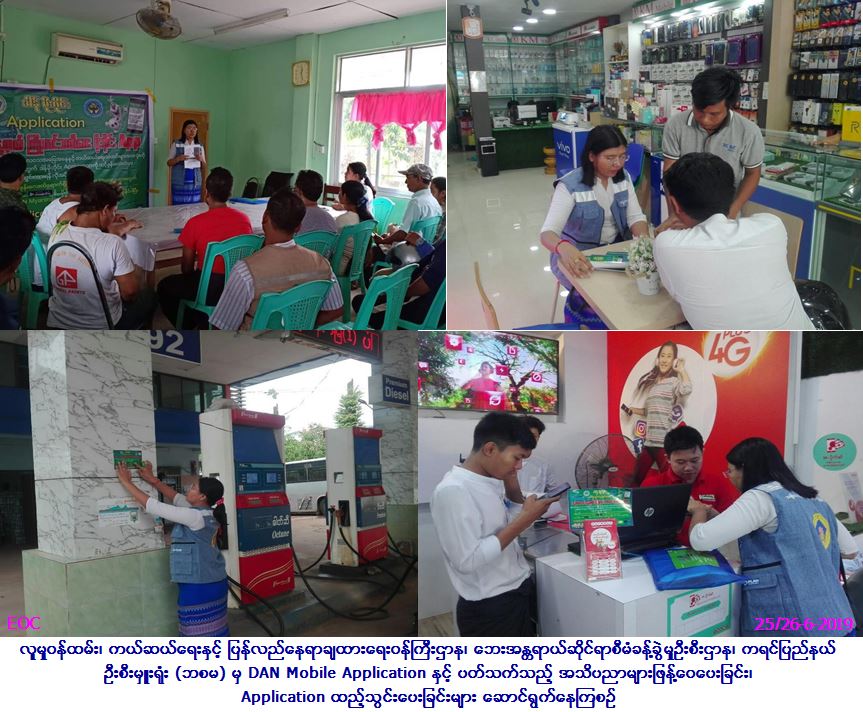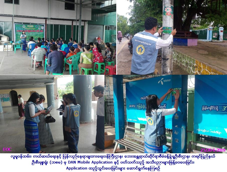 (၂၅-၆-၂၀၁၉)ရက်နေ့တွင် ဘားအံတက္ကသိုလ်အတွင်း၌လည်းကောင်း၊ ဘားအံမြို့နယ် အမှတ် (၂) ဈေးရှိ ဈေးရုံ၌လည်းကောင်း၊ မြို့တွင်းရှိ မိုဘိုင်းဖုန်း အရောင်းဆိုင်များ၌ လည်းကောင်း၊ (၂၆-၆-၂၀၁၉)ရက်နေ့တွင် ဘားအံမြို့၊ မဲဘောင်ဈေးရုံ၌ လည်းကောင်း၊ မော်တော်ယာဉ် ရပ်နားစခန်း (ကားကြီးကွင်း)၌ လည်းကောင်း၊ DAN Mobile Application အသုံးပြုခြင်းဖြင့် သဘာဝဘေးအန္တရာယ် စပ်လျဉ်းပြီး အသက်အိုး အိမ်စည်းစိမ်များ ပျက်စီးဆုံးရှုံးမှုတို့ကို ကာကွယ်နိုင်ခြင်း၊ လျော့ချနိုင်ခြင်းစသည့် အကျိုးကျေးဇူးများရရှိစေနိုင်ကြောင်း ရှင်းလင်းပြောကြားပြီး DAN Mobile Application များဖြန့်ဝေပေးခြင်းနှင့် အသုံးပြုပုံနည်းစနစ်များအား ရှင်းလင်းပြောကြားခြင်း၊ လူစည် ကားသည့် နေရာနှင့် မိုဘိုင်း ဖုန်းအရောင်းဆိုင်များတွင် DAN Mobile Application အသုံးပြုရေး Sticker များကပ်ခြင်းတို့ကို ဆောင်ရွက်ခဲ့ ပါသည်။