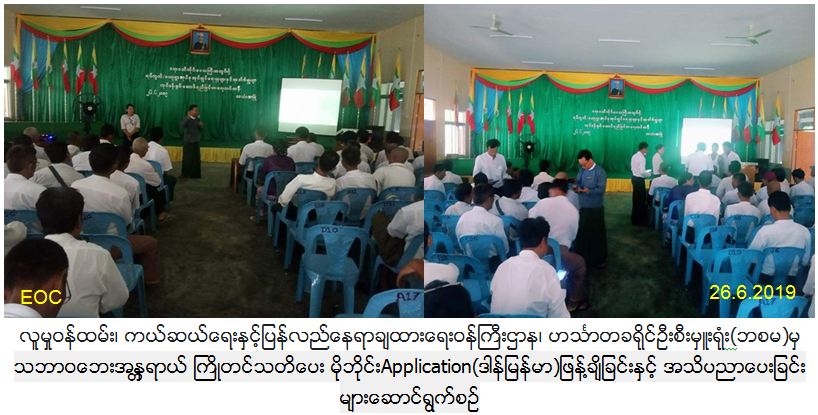 ဘေးအန္တရာယ်ဆိုင်ရာစီမံခန့်ခွဲမှုဦးစီးဌာန၊ ဟင်္သာတခရိုင်ဦးစီးမှူးရုံးမှ တာဝန်ရှိသူများသည် (၂၆-၆-၂၀၁၉)ရက်နေ့တွင် ဟင်္သာတၿမိဳ႕နယ်/ရပ်ကွက်/ကျေးရွာအုပ်စု အုပ်ချုပ်ရေးမှူးနှင့် ရာအိမ်မှူးများအား DAN Mobile Application သုံးစွဲပုံနည်းစနစ်များကို ရှင်းလင်းပြောကြားခဲ့ပြီး တယ်လီဖုန်းများ ထဲသို့ DAN Mobile Application ထည့်သွင်းပေးခဲ့ကြောင်း သတင်းရရှိပါသည်…