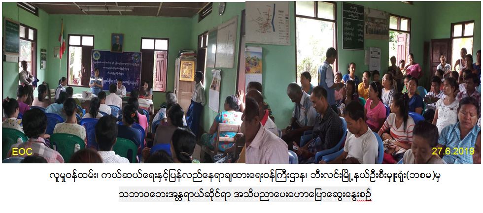 လူမှုဝန်ထမ်း ကယ်ဆယ်ရေးနှင့် ပြန်လည်နေရာချထားရေးဦးစီးဌာန၊ ဘေးအန္တရာယ်ဆိုင်ရာ စီမံခန့်ခွဲမှုဦးစီးဌာန မွန်ပြည်နယ်၊ သထုံခရိုင်၊ ဘီးလင်းမြို့နယ်ဦးစီးမှူးရုံးမှ တာဝန်ရှိသူများသည်(၂၇-၆-၂၀၁၉)ရက်နေ့ (၁၀:၀၀)နာရီ မှ (၁၁:၃၀)နာရီအထိ ဘီးလင်းမြို့နယ်၊ ဆရာစံရပ်ကွက်၌ ပြည်သူ လူထု အင်အား(၁၀၀)ဦးအား သဘာဝဘေး အန္တရာယ်ဆိုင်ရာ အသိပညာပေးဟောပြောဆွေးနွေး ခဲ့ပြီး ဆောင်ရန်/ရှောင်ရန်အချက်များအား ဆွေးနွေးခြင်း လက်ကမ်းစာစောင်များ ဖြန့်ဝေပေးခြင်း များဆောင်ရွက်ခဲ့ပါကြောင်း သတင်းရရှိပါသည်။