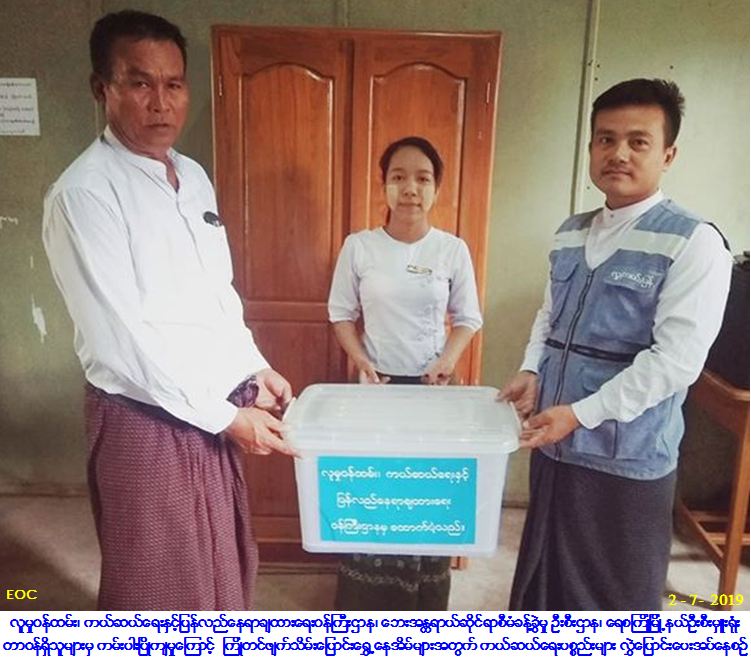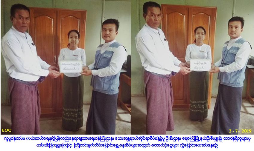 လူမှုဝန်ထမ်း၊ ကယ်ဆယ်ရေးနှင့်ပြန်လည်နေရာချထားရေးဝန်ကြီးဌာန၊ ဘေးအန္တရာယ်ဆိုင်ရာစီမံခန့့်ခွဲမှု ဦးစီးဌာန၊ ရေစကြိုမြို့နယ်ဦးစီးမှူးရုံးမှ တာဝန်ရှိသူများသည် ပခုက္ကူခရိုင်၊ ရေစကြိုမြို့နယ်၊ ကွေ့ထောင့် ကျေးရွာအုပ်စု၊ ကွေ့ထောင့်ကျေးရွာ၌ (၂-၇-၂၀၁၉) ရက်နေ့ (၁၀း၃၀) အချိန်၌ ဧရာဝတီမြစ်ရေတိုက်စား၍ ကမ်းပါးပြိုကျမှုကြောင့် ကြိုတင်ဖျက်သိမ်းပြောင်းရွှေ့ လူနေအိမ် (၆) လုံး၊ အိမ်ထောင်စု (၈) စု၊ လူဦးရေ (၃၃) ဦးတို့အတွက် ကယ်ဆယ်ရေးပစ္စည်း (၁၀) မျိုး၊ ဆန်ရိက္ခာဖိုးငွေ (၇) ရက်စာ (၆၉,၃၀၀/-) ကျပ်၊ အိမ်ဆောက်ပစ္စည်းဖိုးငွေ (၆၀၀,၀၀၀/- ) ကျပ်၊ စုစုပေါင်း ထောက်ပံ့ငွေ (၆၆၉,၃၀၀/-) ကျပ်တို့အား (၂-၇-၂၀၁၉) ရက်နေ့တွင် ရေစကြိုမြို့နယ် အထွေထွေအုပ်ချုပ်ရေးမှူးရုံးမှ တာဝန်ရှိသူများနှင့်အတူ ကွေ့ထောင့်ကျေးရွာအုပ်ချုပ်ရေးမှူးထံသို့ လွှဲပြောင်းထောက်ပံ့ပေးအပ်ခဲ့ကြောင်း သတင်းရရှိပါသည်။