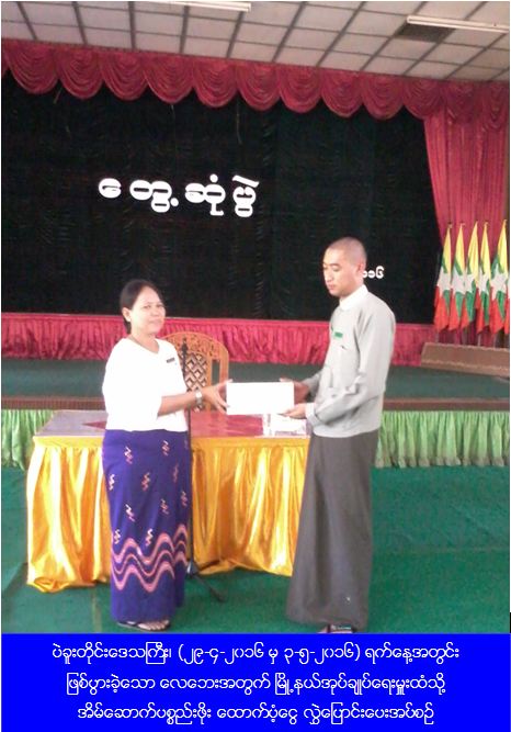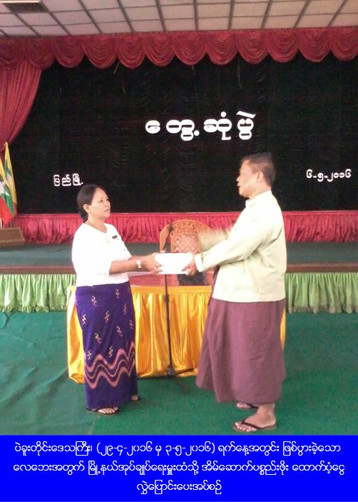 ၁။ ပဲခူးတိုင်းဒေသကြီး၊ သဲကုန်းမြို့နယ်၊ ပေါင်းတည်မြို့နယ်နှင့် ပြည်မြို့နယ်များ အတွင်းရှိ ရပ်ကွက်ကျေးရွာများတွင် (၂၉-၄-၂၀၁၆ မှ ၃-၅-၂၀၁၆) ရက်နေ့အတွင်း ဖြစ်ပွားခဲ့သော လေဘေးကြောင့် လူနေအိမ်များ၊ ဘာသာရေး အဆောက်အအုံများ ပြိုလဲပျက်စီးအမိုးလန်ခြင်းများအတွက် အိမ်ဆောက်ပစ္စည်းဖိုးငွေများအား ကယ်ဆယ်ရေးနှင့်ပြန်လည်နေရာချထားရေးဦးစီးဌာန၊ ပြည်ခရိုင်ဦးစီးမှူးရုံးမှ (၆.၅.၂၀၁၆)ရက်နေ့တွင် ထောက်ပံ့ပေးအပ်ခဲ့ကြောင်း သိရှိရပါသည်။