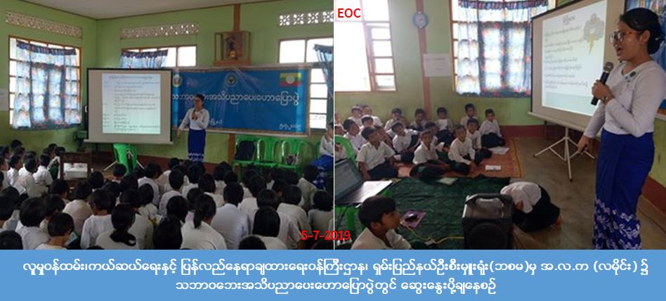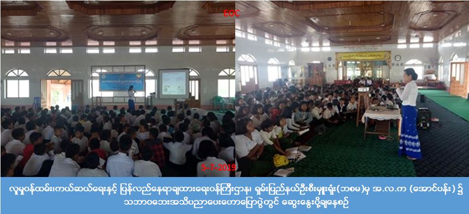 လူမှုဝန်ထမ်း၊ကယ်ဆယ်ရေးနှင့် ပြန်လည်နေရာချထားရေး ဝန်ကြီးဌာန၊ ဘေးအန္တရာယ်ဆိုင်ရာ စီမံခန့်ခွဲမှုဦးစီး ဌာန၊ ရှမ်းပြည်နယ်ဦးစီးမှူးရုံးမှ တာဝန်ရှိသူများသည် (၅-၇-၂၀၁၉)ရက်နေ့ နံနက်ပိုင်းတွင် ကလောမြို့နယ် အ.လ.က (အောင်ပန်း)၌ကျာင်းသား/သူ (၂၅၀)ဦးအားလည်းကောင်း၊ နေ့လယ်ပိုင်းတွင် ကလောမြို့နယ် အ.လ.က (လမိုင်း) ၌ကျာင်းသား/ သူ (၂၀၀)ဦးတို့အား သဘာဝဘေးအသိပညာပေးဟောပြောပွဲများ ပြုလုပ် ခဲ့ပြီး လက်ကမ်းစာစောင်များဖြန့်ဝေခြင်း၊ ပညာပေးဗွီဒီယိုပြသခြင်းသရုပ်ပြသခြင်းများ ဆောင်ရွက်ခဲ့ကြောင်း သိရှိရပါသည်။