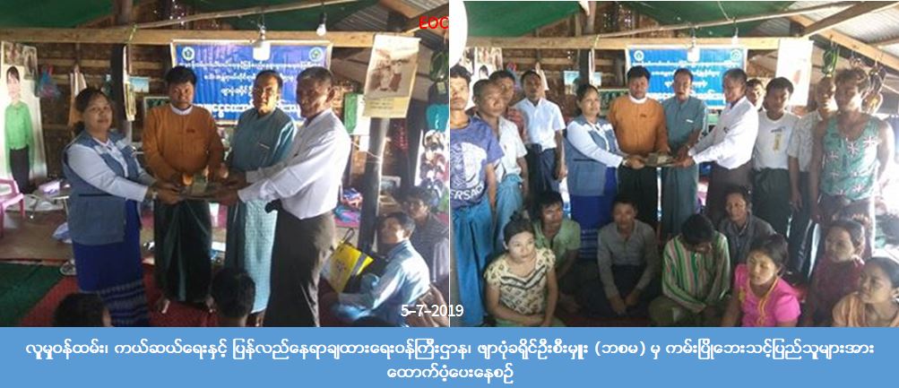 လူမှုဝန်ထမ်း၊ ကယ်ဆယ်ရေးနှင့် ပြန်လည်နေရာချထားရေး ဝန်ကြီးဌာန၊ ဘေးအန္တရာယ်ဆိုင်ရာ စီမံခန့်ခွဲမှုဦးစီး ဌာန၊ ဖျာပုံခရိုင်ဦးစီးမှူးရုံးမှတာဝန်ရှိသူများသည် (၅-၇-၂၀၁၉) ရက်နေ့တွင် ဖျာပုံမြို့နယ်၊ အမာမြို့၊ နောက်မီး ကျေးရွာအုပ်စု၊ ဦးပေကျေးရွာတွင် ဦးပေချောင်းသည် (၁၅-၅-၂၀၁၉)ရက်နေ့မှ စတင်၍ ချောင်းရေတိုက်စား မှုကြောင့် ကမ်းပြိုမှုဖြစ်ခဲ့ရာ ကမ်းနှင့်မလွတ်ကင်းသည့် နေအိမ် (၃၂)အိမ်အတွက် ကြိုတင်ပြောင်းရွေ့ ရမည် ဖြစ်ခြင်းအတွက်အိမ်ခြေ/ အိမ်ထောင်စု(၃၂)စုအတွက် အိမ်ဆောက်ပစ္စည်းဖိုးငွေ (၁,၆၀၀,၀၀၀) ကျပ်၊ ဆန်ဖိုး ငွေလူဦးရေ(၁၃၉)ဦးအတွက် (၂၉၁,၉၀၀) ကျပ်တို့ကို ဖျာပုံမြို့နယ်ပြည်သူ့လွှတ်တော် ကိုယ်စားလှယ် အဖွဲ့နှင့် အတူကမ်းပြိုဘေးဖြစ်ပွားသည့် နေရာဘေးသင့်ပြည်သူများ လက်ဝယ်သို့ထောက်ပံ့ပေးအပ်ခဲ့ပါသည်။ ထို့နောက် ပြောင်းရွှေ့ကြမည့်မြေနေရာကိုကြည့်ရှု့ခဲ့ပြီး နောက်မီးကျေးရွာတွင် သဘာဝဘေးကော်မတီရန်ပုံငွေဖြင့် တည် ဆောက်ခဲ့သည့်Cyclone Shelter ၏ပျက်စီးမှုဖြစ်ပေါ်နေသည့် နေရာများကို ကြည့်ရှု့စစ်ဆေးခဲ့ကြောင်း သိရှိရပါသည်။