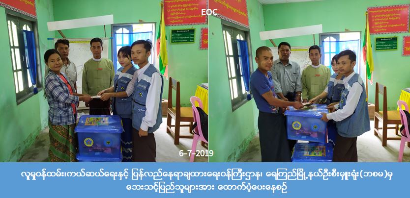 လူမှုဝန်ထမ်း၊ ကယ်ဆယ်ရေးနှင့်ပြန်လည်နေရာချထား ရေးဝန်ကြီးဌာန၊ ဘေးအန္တရာယ်ဆိုင်ရာ စီမံခန့်ခွဲမှု ဦးစီး ဌာန၊ ရေကြည်မြို့နယ်ဦးစီးမှူးရုံးမှတာဝန်ရှိသူများသည် ရေကြည်မြို့နယ် ၊ ငါးသိုင်းချောင်းမြို့၊ ရေနံသာ ကျေးရွာအုပ်စု၊ မအူကုန်းကျေးရွာအုပ်စုနှင့် ကွင်းလျားကျေးရွာအုပ်စု တို့တွင်(၂-၇-၂၀၁၉)ရက်နေ့တွင် ဖြစ်ပွား ခဲ့သော ကမ်းပြိုဘေးကြောင့် ကြိုတင်ဖျက်သိမ်းပြောင်းရွှေ့ခဲ့ရသည့် နေအိမ်(၂)လုံးအတွက် အိမ်ဆောက် ပစ္စည်းဖိုး(၂၀၀,၀၀၀)ကျပ်၊လူဦးရေ(၆)ဦးအတွက် (၇)ရက်စာရန်ပုံငွေ (၁၂၆,၀၀၀)ကျပ်၊ (၄-၇-၂၀၁၉) ရက်နေ့ တွင်ဖြစ်ပွားသောေ လဘေးကြောင့် (ပြိုကျ/ပျက်စီး)ခဲ့သည့်နေအိမ် (၄)လုံးအတွက် အိမ်ဆောက်ပစ္စည်းဖိုး (၄၀၀,၀၀၀) ကျပ်၊ လူဦးရေ(၁၄)ဦးအတွက် (၇)ရက်စာရန်ပုံငွေ(၂၉,၄၀၀)ကျပ်၊ စုစုပေါင်းရန်ပုံငွေ (၆၄၂,၀၀၀) ကျပ်နှင့် ကယ်ဆယ်ရေး ပစ္စည်း(၁၆)မျိုးပါ (၄)အိမ်ထောင်စာ (၁၄၉,၄၁၂)ကျပ်တို့အား (၆-၇-၂၀၁၉)ရက်နေ့ (၁၁:၀၀) နာရီအချိန်တွင် တာဝန်ရှိသူများ ရှေ့မှောက်၌ ဘေးသင့်ပြည်သူ များ၏လက်ဝယ်သို့ ထောက်ပံ့ပေးအပ် ခဲ့ကြောင်း သိရှိရပါသည်။