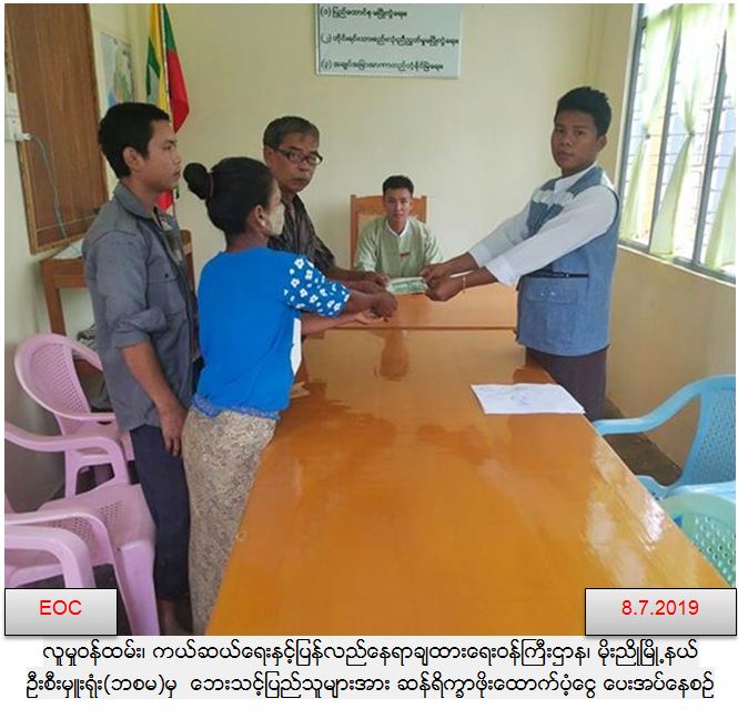 လူမှုဝန်ထမ်း ကယ်ဆယ်ရေးနှင့် ပြန်လည်နေရာချထားရေးဝန်ကြီးဌာန၊ ဘေးအန္တရာယ်ဆိုင်ရာစီမံခန့်ခွဲမှုဦးစီးဌာန၊ မိုးညိုမြို့နယ်ဦးစီးမှူး ရုံးမှ တာဝန်ရှိသူများသည် (၆-၇-၂၀၁၉)ရက်နေ့တွင် လေပြင်းတိုက်ခက်မှုကြောင့်အုတ်ဖိုမြို့နယ်၊ အိုးသည်ကုန်းမြို့၊ ပြည်တော်သာ ရပ်ကွက်၊ ဓနဝတီလမ်းတွင် ဖြစ်ပွားခဲ့သော လေဘေးကြောင့် နေအိမ်(၂)လုံး အမိုးလန်ပျက်စီးခဲ့ပြီး ဘေးသင့်လူဦးရေ(၁၁)ဦးတို့အတွက် ဆန်ရိက္ခာဖိုးထောက်ပံ့ငွေ (၂၃၁၀၀ိ/-)ကျပ်တိတိအား (၈-၇-၂၀၁၉)ရက်နေ့ (၀၉း၃၀)နာရီအချိန်တွင် အိုးသည်ကုန်းမြို့ အုပ်ချုပ်ရေးမှူးရုံး အစည်းအဝေးခန်းမတွင် ဒုတိယမြို့နယ်ဦးစီးမှူး၊ သက်ဆိုင်ရာရပ်ကွက်အုပ်ချုပ်ရေးမှူး၊ စာရေးများနှင့်အတူဘေးသင့် ပြည်သူများ၏ လက်ဝယ်အရောက် ထောက်ပံ့ပေးအပ်ခဲ့ပါကြောင်း သတင်းရရှိပါသည်။