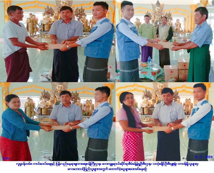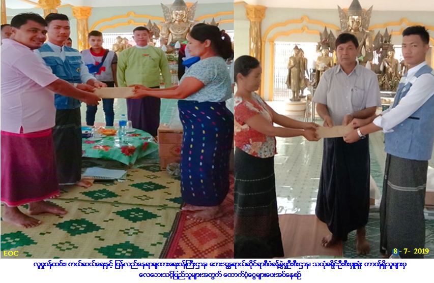 လူမှုဝန်ထမ်း၊ ကယ်ဆယ်ရေးနှင့် ပြန်လည်နေရာချထားရေးဝန်ကြီးဌာန၊ ဘေးအန္တရာယ်ဆိုင်ရာစီမံခန့်ခွဲမှုဦးစီးဌာန၊ သထုံခရိုင်ဦးစီးမှူးရုံးမှ တာဝန်ရှိသူများသည် မွန်ပြည်နယ်၊ ပေါင်မြို့နယ်၊ ပန်းကုန်းကျေးရွာအုပ်စု၊ အမှတ် (၁၅) ရပ်ကွက်အတွင်း၌ (၇-၇-၂၀၁၉) ရက်နေ့တွင် ဖြစ်ပွားခဲ့သော လေဘေးကြောင့် အမိုးလန်နေအိမ် (၆) လုံးအတွက် အိမ်ဆောက်ပစ္စည်းဖိုးငွေ (၆၀၀,၀၀၀/-) ကျပ်၊ လူဦးရေ (၂၂) ဦးတို့အတွက် ဆန်ရိက္ခာဖိုးငွေ (၇) ရက်စာ (၄၆,၂၀၀/-) ကျပ်တို့အား (၈-၇-၂၀၁၉) ရက်နေ့တွင် သွားရောက်ထောက်ပံ့ပေးအပ်ခဲ့ကြောင်း သတင်းရရှိပါသည်။