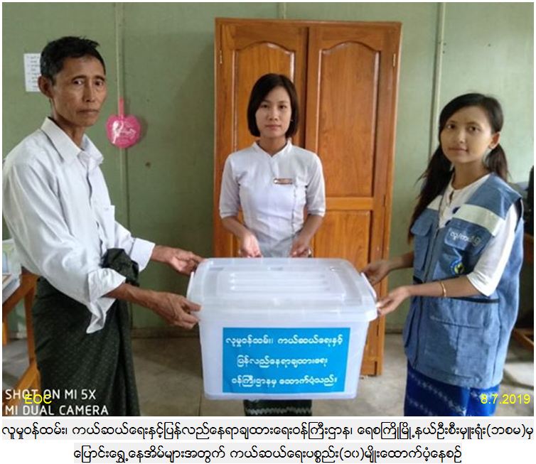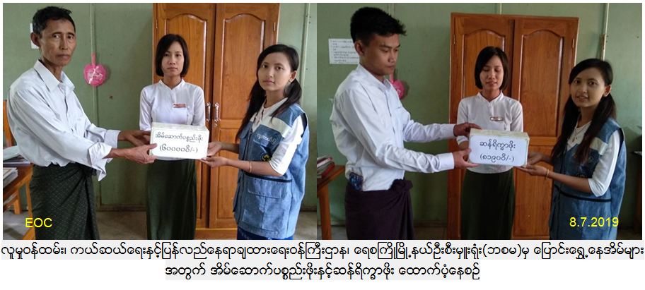 လူမှုဝန်ထမ်း၊ ကယ်ဆယ်ရေးနှင့်ပြန်လည်နေရာချထားရေးဝန်ကြီးဌာန၊ ဘေးအန္တရာယ်ဆိုင်ရာစီမံခန့်ခွဲမုှဦးစီးဌာန၊ မကွေးတိုင်းဒေသကြီး၊ ပခုက္ကူ ခရိုင်၊ ရေစကြိုု မြို့နယ်ဦးစီးမှူး ရုံးမှတာဝန်ရှိသူများသည် ရေစကြိုမြို့နယ်၊ ငါးလန်ကျေးရွာအုပ်စု၊ငါးလန်ကျေးရွာနှင့် ဇယမကျေးရွာအုပ်စု၊ ဇယမကျေးရွာတို့တွင် (၈.၇.၂၀၁၉)ရက်နေ့(၁၀း၃၀)အချိန်၌ ဧရာဝတီမြစ်ရေတိုက်စား၍ ကမ်းပါးပြိုကျမှုကြောင့် လူနေအိမ်ကြိုတင်ဖျက်သိမ်းပြောင်း ရွှေ့မှုများဆောင်ရွက်ခဲ့ကြရာ ကြိုတင်ဖျက်သိမ်းပြောင်းရွှေ လူနေအိမ်(၆) လုံး၊ အိမ်ထောင်စု(၈)စု၊ လူဦးရေ(၃၉)ဦးတို့အတွက် ကယ်ဆယ်ရေးပစ္စည်း(၁၀)မျိုး၊ ဆန်ရိက္ခာဖိုး(၇)ရက်စာ(၈၁၉၀ဝိ/-)၊ အိမ်ဆောက်ပစ္စည်းဖိုး (၆၀၀၀၀ဝိ/- )စုစုပေါင်း(၆၈၁၉၀ဝိ/-)ကျပ်အား (၈.၇.၂၀၁၉)ရက်နေ့တွင် ရေစကြို မြို့နယ် အထွေထွေအုပ်ချုပ်ရေးမှူးရုံးမှ တာဝန်ရှိသူများနှင့်အတူ ငါးလန်ကျေးရွာအုပ်ချုပ်ရေးမှူ းနှင့် ဇယမကျေးရွာအုပ်ချုပ်ရေးမှူ းတို့လက်ဝယ်အရောက် ထောက်ပံ့ပေးအပ်ခဲ့ကြောင်း သတင်းရရှိပါသည်။