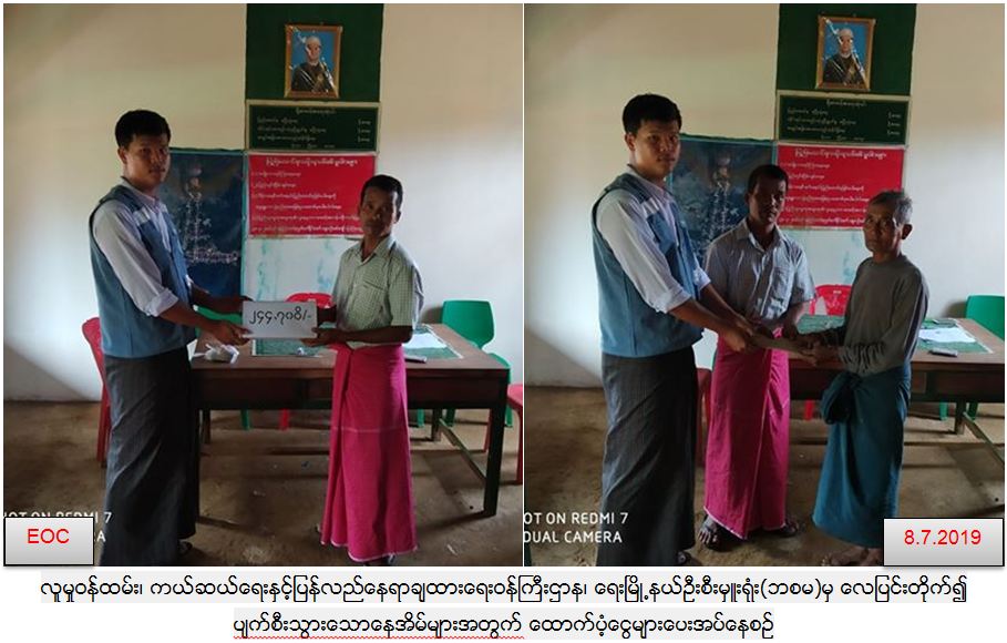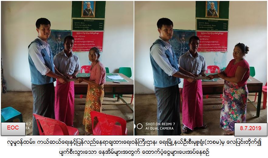 လူမှုဝန်ထမ်း၊ ကယ်ဆယ်ရေးနှင့်ပြန်လည်နေရာချထားရေးဝန်ကြီးဌာန၊ မွန်ပြည်နယ်၊ ရေးမြို့နယ်၊ အံဒင်ကျေးရွာတွင် (၆.၇.၂၀၁၉)ရက်နေ့၌ လေပြင်းတိုက်ခတ်မှုကြောင့် အမိုးလန်ပျက်စီးသွားသော နေအိမ်(၅)လုံးအတွက် အိမ်ဆောက်ပစ္စည်းဖိုးငွေ (၁၈၅၉၀၀)ကျပ် နှင့် လူဦးရေ (၂၈)ဦးအတွက် (၇)ရက်စာ ဆန်ရိက္ခာဖိုးငွေ (၅၈၈၀၀)ကျပ်၊ စုစုပေါင်း (၂၄၄၇၀၀)ကျပ်အား ရေးမြို့နယ်ဦးစီးမှူးရုံးမှ (၈.၇.၂၀၁၉)ရက်နေ့တွင် သွားရောက်ထောက်ပံ့ခဲ့ကြောင်း သတင်းရရှိပါသည်။