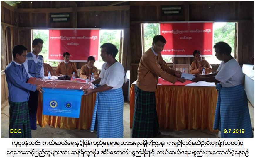 လူမှုဝန်ထမ်း၊ ကယ်ဆယ်ရေးနှင့်ပြန်လည်နေရာချထားရေးဝန်ကြီးဌာန၊ ကချင်ပြည်နယ်မြို့၊ ဝိုင်းမော်မြို့၊ မိုင်းနားကျေးရွာအုပ်စု၊ ဂွေထုကျေးရွာတွင် (၂၆-၆-၂၀၁၉)နေ့တွင် ဖြစ်ပွားခဲ့သော ရေဘေးကြောင့် ရေဘေးသင့်အိမ်ထောင်စု(၁၃)စု၊ လူဦးရေ(၄၇)ဦးတို့အတွက် ဆန်ရိက္ခာ(၁)ပတ်စာ(၉၈,၇၀ဝိ)ကျပ်နှင့် မျှောပါပျက်စီးအိမ်ထောင်စု(၁)စုအတွက် အိမ်ဆောက်ပစ္စည်းဖိုး(၁၀၀,၀၀ဝိ)ကျပ်နှင့် ကယ်ဆယ်ရေးပစ္စည်း(၁၇)မျိုး (၁)အိမ်ထောင်စုစာအား (၉-၇-၂၀၁၉)ရက်နေ့ နံနက်(၁၀:၀၀)နာရီအချိန်တွင် ကချင်ပြည်နယ်ဦးစီးမှူးရုံးမှ ထောက်ပံ့ပေးအပ်ခဲ့ကြောင်း သတင်းရရှိပါသည်။