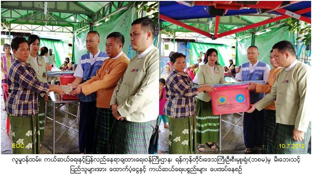 လူမှုဝန်ထမ်း၊ ကယ်ဆယ်ရေးနှင့်ပြန်လည်နေရာချထားရေးဝန်ကြီးဌာန၊ ဘေးအန္တရာယ်ဆိုင်ရာစီမံခန့်ခွဲမှုဦးစီးဌာန၊ ရန်ကုန်တိုင်းဒေသကြီးဦးစီးမှူးရုံးမှ ရန်ကုန်တိုင်း၊ ဒဂုံမြို့သစ်(တောင်ပိုင်း)မြို့နယ် ၊ အမှတ်(၇၂)ရပ်ကွက် ၊ စွယ်တော်လမ်းတွင် (၄.၇.၂၀၁၉)ရက်နေ့၌ မီးလောင်မှုဖြစ်ပွားခဲ့ရာ ပျက်စီးဆုံးရှုံးသွားသော နေအိမ်(၁)လုံးနှင့် သေဆုံးဒဏ်ရာပြည်သူများအတွက် အိမ်ဆောက်ပစ္စည်းဖိုးငွေကျပ်(၂၀၀,၀၀ဝိ/-)၊ သေဆုံးထောက်ပံ့ငွေကျပ် (၃၀၀,၀၀ဝိ/-)၊ ဒဏ်ရရာထောက်ပံ့ငွေကျပ် (၅၀,၀၀ဝိ/-)၊ ဆန်ရိက္ခာ(၇)ရက်စာဖိုးငွေကျပ်(၆၃၀ဝိ/-)၊ စုစုပေါင်းထောက်ပံ့ငွေကျပ် (၅၅၆,၃၀ဝိ/-)နှင့် ကယ်ဆယ်ရေးပစ္စည်း (၁၆)မျိုး(၁)အိမ်ထောင်စုစာအား (၁၀.၇.၂၀၁၉)ရက်နေ့တွင် တိုင်းဒေသကြီးလွှတ်တော်ကိုယ်စားလှယ်များ၊ သက်ဆိုင်ရာမြို့နယ်ထွေ/အုပ်၊ ရပ်ကွက်အုပ်ချုပ်ရေးမှူးတို့နှင့်အတူ ထောက်ပံ့ပေးအပ်ခဲ့ကြောင်း သတင်းရရှိပါသည်။