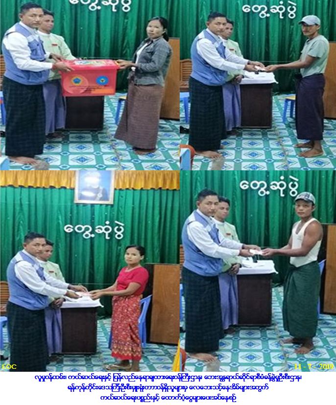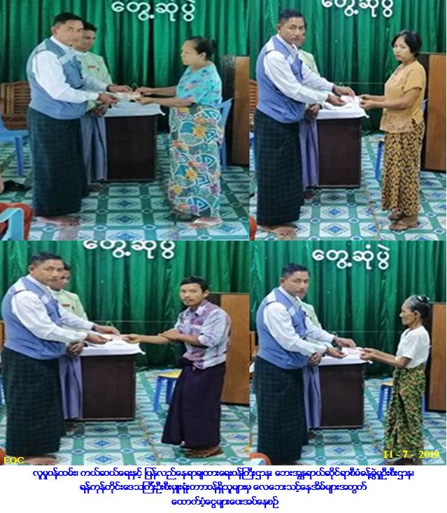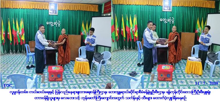 လူမှုဝန်ထမ်း၊ ကယ်ဆယ်ရေးနှင့် ပြန်လည်နေရာချထားရေးဝန်ကြီးဌာန၊ ဘေးအန္တရာယ်ဆိုင်ရာစီမံခန့်ခွဲမှုဦးစီးဌာန၊ ရန်ကုန်တိုင်းဒေသကြီးဦးစီးမှူးရုံးမှ တာာဝန်ရှိသူများသည် ရန်ကုန်တိုင်းဒေသကြီး၊ တိုက်ကြီးမြို့နယ်၊ အလယ်ဘုတ် ကျေးရွာအုပ်စုနှင့် မလေးရှားဝိုင်ကျေးရွာအုပ်စုတို့တွင် (၁-၇-၂၀၁၉) ရက်နေ့၌ လေပြင်းတိုက်ခတ်မှု ကြောင့် နေအိမ် (၈) လုံးနှင့် ဘုန်းကြီးကျောင်း (၁) ကျောင်း အမိုးလန်ပျက်စီး၍ နေအိမ် (၁) လုံးပြိုကျပျက်စီးခဲ့ရာ အိမ်ထောင်စု (၉) စုမှ လူဦးရေ (၄၂) ဦးတို့ လေဘေးသင့်ခဲ့ပြီး တိုက်ကြီးမြို့နယ်၊ ဥက္ကံမြို့၊ ကျွဲဘုတ်ကျေးရွာအုပ်စုအတွင်း၌ (၇-၇-၂၀၁၉) ရက်နေ့တွင် ဖြစ်ပွားခဲ့သော လေပြင်းတိုက်ခတ်မှုကြောင့် ဘေးသင့် အမိုးလန် နေအိမ် (၁၂) လုံး၊ အိမ်ထောင်စု (၁၂) စုတို့မှ လူဦးရေ (၅၅) ဦးတို့အတွက် အိမ်ဆောက်ပစ္စည်းဖိုးငွေ (၁,၀၅၀,၀၀၀/-) ကျပ်၊ ဆန်ရိက္ခာဖိုးငွေ (၇) ရက်စာ (၂၀၃,၇၀၀/-) ကျပ်၊ ကယ်ဆယ်ရေးပစ္စည်း (၁၁) မျိုး (၁) ထောင်စာနှင့် သင်္ကန်း(၄) စုံနှင့် ထီး (၄) လက်တို့အား (၁၁-၇-၂၀၁၉) ရက်နေ့တွင် ဘေးသင့်ပြည်သူများလက်ဝယ်သို့ သက်ဆိုင်ရာ မြို့နယ်ထွေအုပ်တို့နှင့်အတူ သွားရောက်ထောက်ပံ့ပေးအပ်ခဲ့ကြောင်း သတင်းရရှိပါသည်။