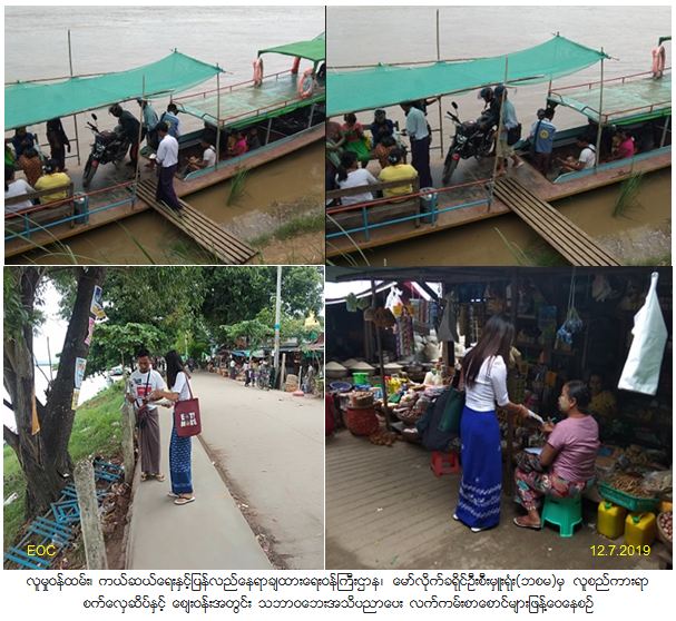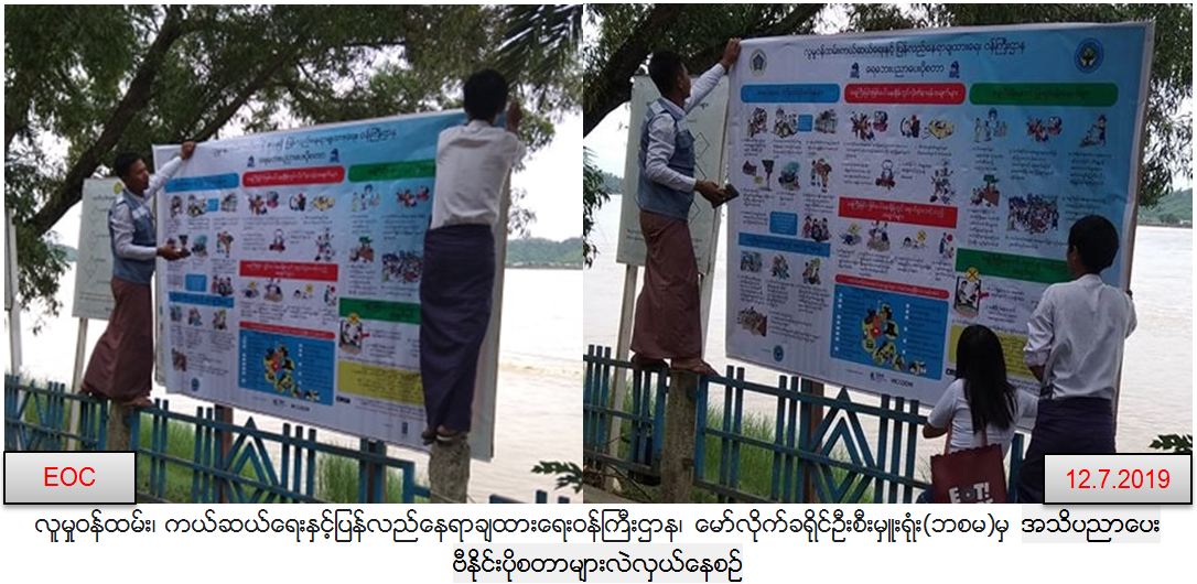 လူမှုဝန်ထမ်း၊ ကယ်ဆယ်ရေးနှင့်ပြန်လည်နေရာချထားရေးဝန်ကြီးဌာန၊ ဘေးအန္တရာယ်ဆိုင်ရာစီမံခန့်ခွဲမှုဦးစီးဌာန၊ မော်လိုက်ခရိုင်ဦးစီးမှူးရုံးမှ တာဝန်ရှိသူများသည် (12-7-2019)ရက်နေ့တွင် မော်လိုက်မြို့ဈေးရှေ့ ချင်းတွင်းမြစ်ကမ်းဘေးတွင် ရေဘေးလူထုအသိပညာပေး ဗီနိုင်းဆိုင်းဘုတ်လဲလှယ်ခဲ့ပြီး လူစည်ကားရာစက်လှေဆိပ်နှင့် ဈေးဝင်းအတွင်း ရေဘေးအသိပညာပေး လက်ကမ်းစာစောင်များဖြန့်ဝေခဲ့ကြောင်း သတင်းရရှိပါသည်။