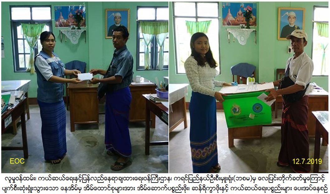 လူမှုဝန်ထမ်း၊ ကယ်ဆယ်ရေးနှင့်ပြန်လည်နေရာချထားရေးဝန်ကြီးဌာန၊ ဘေးအန္တရာယ်ဆိုင်ရာစီမံခန့်ခွဲမှုဦးစီးဌာန၊ ကရင်ပြည်နယ်ဦးစီးမှူးရုံးမှ (၆-၇-၂၀၁၉)ရက်နေ့ လှိုင်းဘွဲ့မြို့နယ်၊ ရွှေဂွန်းကျေးရွာအုပ်စု၊ ကမ်းနီကျေးရွာနှင့် ပိုင်ကျုံမြို့၊ ကော့မရိုင်းကျေးရွာအုပ်စု၊ ကျိုက်ပေါင်ကျေးရွာတို့တွင် မိုးသည်းထန်စွာရွာသွန်းပြီး လေပြင်းတိုက်ခတ်မှုကြောင့် နေအိမ်(၁)လုံး ပြိုကျပျက်စီးခဲ့ပြီး နေအိမ်(၂)လုံးမှာ တစ်စိတ်တစ်ပိုင်းပျက်စီးခဲ့သဖြင့် အိမ်ထောင်စု(၃)စု လူဦးရေ(၁၈)ဦး ဘေးဒုက္ခခံစားခဲ့ရသောကြောင့် (၁၂-၇-၂၀၁၉)ရက်နေ့တွင် ပျက်စီးနေအိမ်(၁)လုံးအတွက် ကယ်ဆယ်ရေးပစ္စည်း(၁၁)မျိုး တစ်အိမ်ထောင်စာ အိမ်ဆောက်ပစ္စည်းဖိုးငွေ(၁၀၀၀၀၀/-)နှင့် ဆန်ရိက္ခာဖိုးငွေ(၁၄၇၀၀/-)၊ တစ်စိတ်တစ်ပိုင်းပျက်စီးနေအိမ်(၂)လုံးအတွက် အိမ်ဆောက်ပစ္စည်းဖိုးငွေ(၁၈၀၀၀၀/-) နှင့် ဆန်ရိက္ခာ (၇)ရက်စာ (၂၃၁၀၀/-) စုစုပေါင်းကျပ် (၃၁၇၈၀၀/-)အား ထောက်ပံ့ပေးခဲ့ကြောင်း သတင်းရရှိပါသည်။