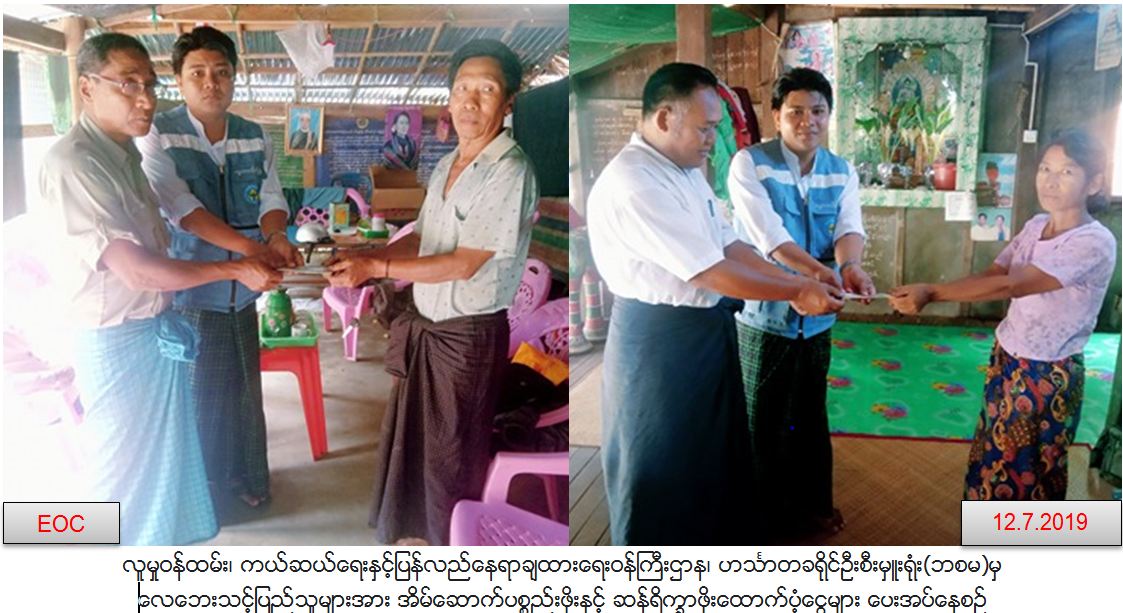 လူမှုဝန်ထမ်း၊ ကယ်ဆယ်ရေးနှင့်ပြန်လည်နေရာချထားရေးဝန်ကြီးဌာန၊ ဘေးအန္တရာယ်ဆိုင်ရာစီမံခန့်ခွဲမှုဦးစီးဋ္ဌာန၊ ဟင်္သာတခရိုင်ဦးစီးမှူးရုံးမှ အင်္ဂပူမြို့နယ်၊ နောက်မီးအုပ်စု၊ ကြို့ကုန်းရွာ၊ အိုးကွဲအုပ်စုပျိုးကုန်းရွာ၊ ခွေးတောက်ချောင်းအုပ်စု၊ ပတ္တမြားကွျွန်းကျေးရွာတို့တွင် (၁၁-၇-၂၀၁၉)ရက်နေ့လေဘေးကြောင့် လုံးဝပျက်စီးခဲ့သောအိမ်ခြေ(၁)လုံးနှင့် အမိုးလန်ပျက်စီးခဲ့သောအိမ်ခြေ(၃)လုံး စုစုပေါင်းအိမ်ခြေ(၄)လုံး၊ ၎င်းအိမ်ထာင်စု(၄)စုရှိ လူဦးရေ(၂၁)ဦးတို့အတွက် (၃၂၃၅၃)ကျပ် တန်ဖိုးရှိသောကယ်ဆယ်ရေးပစ္စည်း(၁၅)မျိုး(၁)အိမ်ထောင်စုစာ၊ အိမ်ဆောက်ပစ္စည်းဖိုး(၂၁၀၀၀၀)ကျပ်၊ ဆန်ရိက္ခာဖိုး(၄၄၁၀၀)ကျပ်၊ စုစုပေါင်းထောက်ပံ့ရန်ပုံငွေ(၂၅၄၁၀၀)ကျပ်ကို (၁၂-၇-၂၀၁၉)ရက်နေ့တွင် သက်ဆိုင်ရာ တာဝန်ရှိသူများနှင့်အတူ ဘေးသင့်ပြည်သူများလက်ဝယ်သို့အရောက် ထောက်ပံ့ပေးခဲ့ကြောင်း သတင်းရရှိပါသည်။