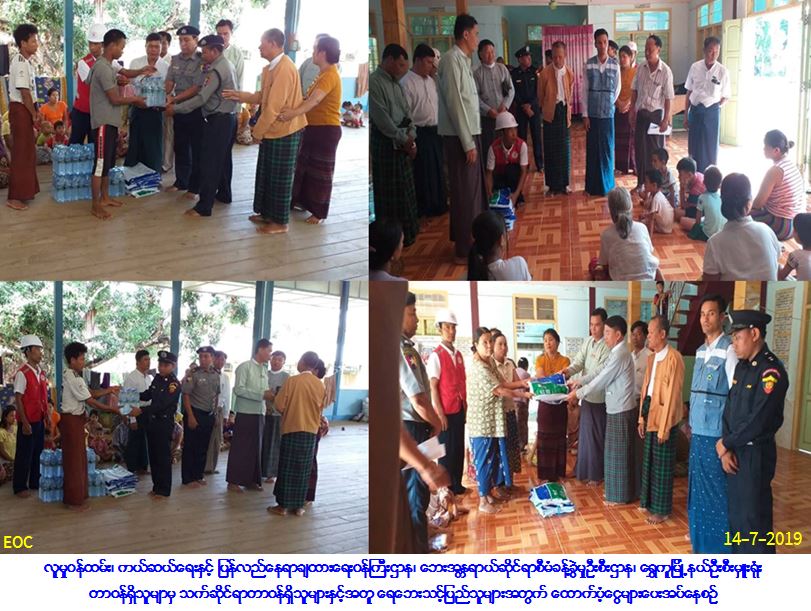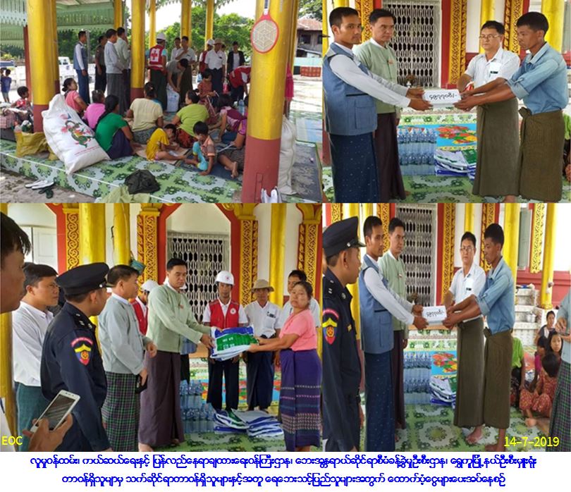 လူမှုဝန်ထမ်း၊ ကယ်ဆယ်ရေးနှင့် ပြန်လည်နေရာချထားရေးဝန်ကြီးဌာန၊ ဘေးအန္တရာယ်ဆိုင်ရာ စီမံခန့်ခွဲမှုဦးစီးဌာန၊ ရွှေကူမြို့နယ်ဦးစီးမှူးရုံးမှ တာဝန်ရှိသူများသည် ရွှေကူမြို့၊ အမှတ် (၄) ရပ်ကွက်၊ အမှတ် (၃) ရပ်ကွက်နှင့် ရွှေကူမြို့နယ်၊ တောပုန်းကျေးရွာတို့တွင် (၁၂-၇-၂၀၁၉) ရက်နေ့နှင့် (၁၃-၇-၂၀၁၉) ရက်နေ့တို့၌ ဧရာဝတီမြစ်ရေ မြင့်တက်လာမှုကြောင့် ယာယီပြောင်းရွှေ့စခန်းများဖြစ်ကြသော ရွှေကူမြို့၊ မြဝတီဘုန်းတော်ကြီးကျောင်း၊ သူဌေးတောရ ဘုန်းတော်ကြီးကျောင်း၊ အောင်တော်မူဘုန်းတော်ကြီးကျောင်းနှင့် ပုဗ္ဗာရုံဘုန်းတော်ကြီးကျောင်းသို့ အိမ်ထောင်စု (၄၆) စု၊ လူဦးရေ (၂၃၇) ဦးတို့သည် အသီးသီးပြောင်းရွှေ့နေထိုင်လျက်ရှိပြီး အဆိုပါ လူဦးရေ (၂၃၇) ဦးအတွက် ဆန်ရိက္ခာ ဖိုးငွေ (၇) ရက်စာ (၄၉၇,၇၀၀/-) ကျပ်တို့အား (၁၄-၇-၂၀၁၉) ရက်နေ့ နံနက် (၀၉းဝဝ) နာရီအချိန်တွင် အထွေထွေအုပ်ချုပ်ရေးမှူး၊ လွှတော်အမှတ်များ၊ သက်ဆိုင်ရာဌာနများနှင့်အတူ ယာယီပြောင်းရွှေ့စခန်းသို့ သွားရောက်ထောက်ပံ့ပေးအပ်ခဲ့ကြောင်း သတင်းရရှိပါသည်။